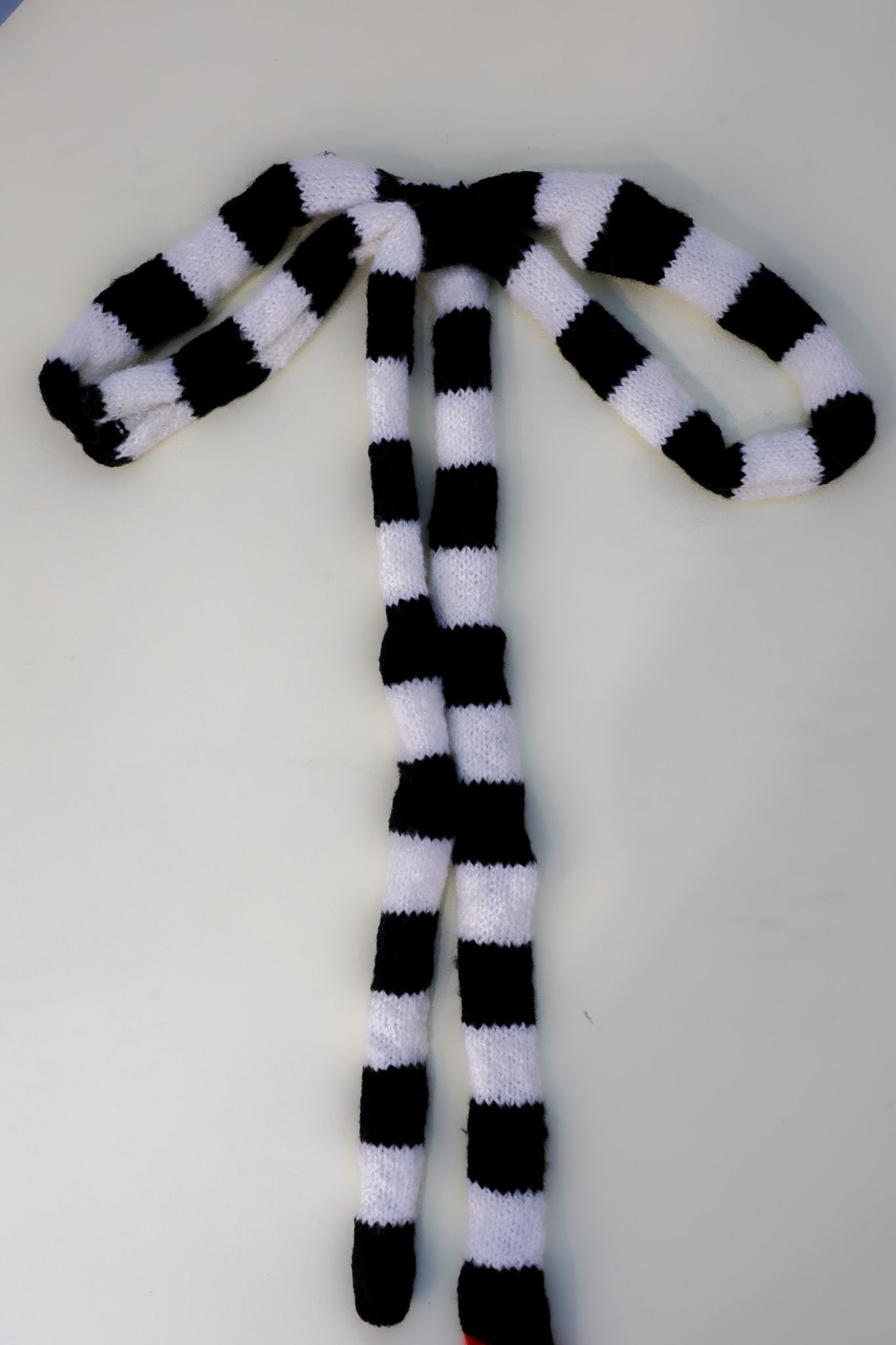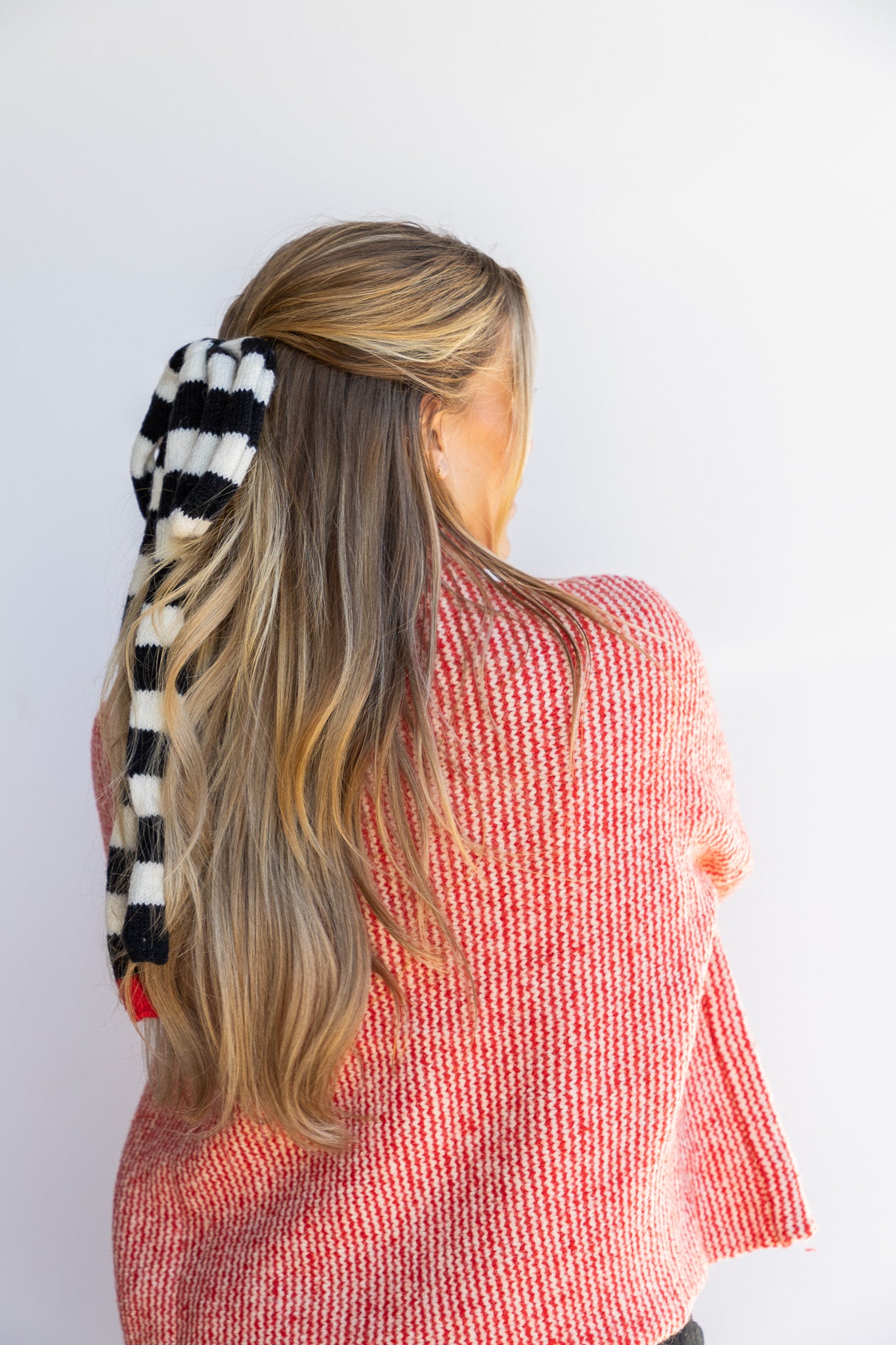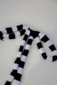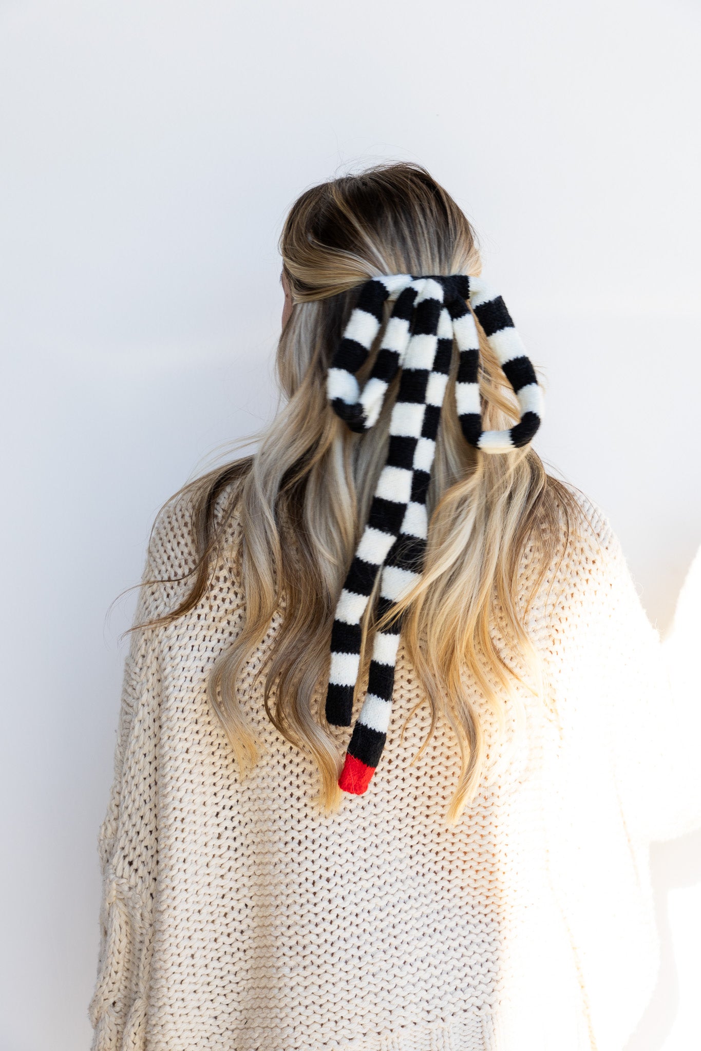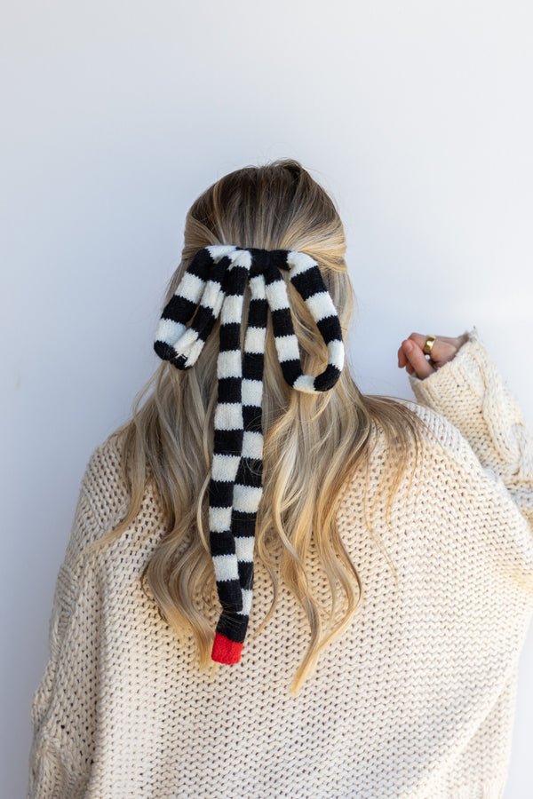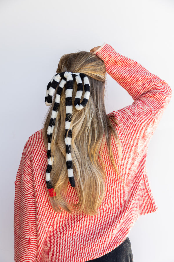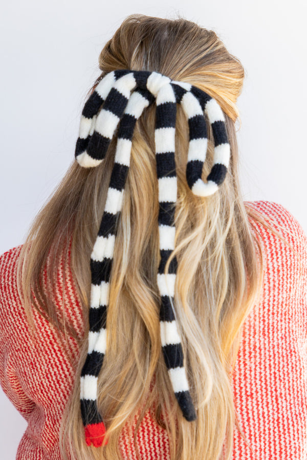 Make a statement with this cozy-chic hair accessory. Crafted from a soft knit fabric in thick black and white horizontal stripes, this oversized bow features long, draping tails for dramatic flair and is securely attached to a large barrette clip for an easy, stay-put hold.