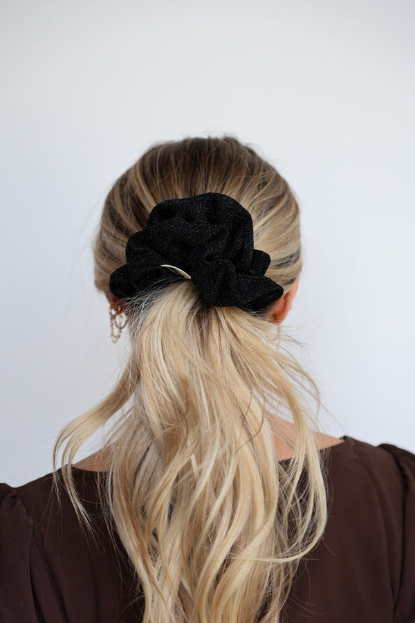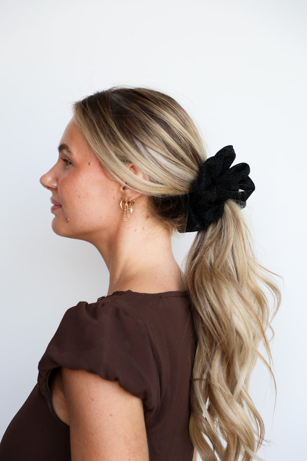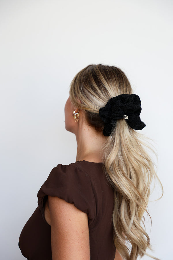 This beautiful oversized scrunchie is 3x the size of a normal scrunchie, and way cuter too. Perfect to spice up your updo's, and holds more hair too. Not to mention it is healthier for your hair! The extra material acts are a barrier between tight elastics, and your hair to help avoid damage. This scrunchie is made of a lightweight glitter fabric.