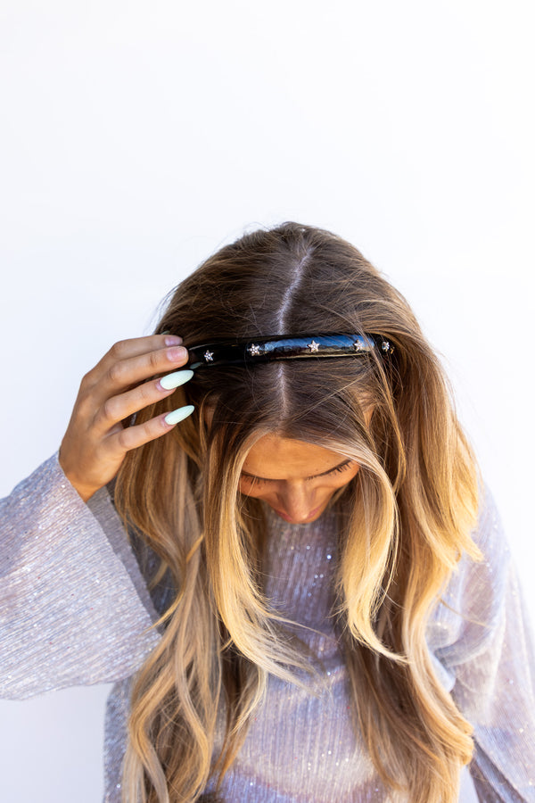 Sleek and celestial, this black headband is dotted with sparkling silver star studs for the perfect mix of edgy and glam. Whether you’re dressing up for a night out or adding a little shine to your everyday look, this piece is a star all on its own.