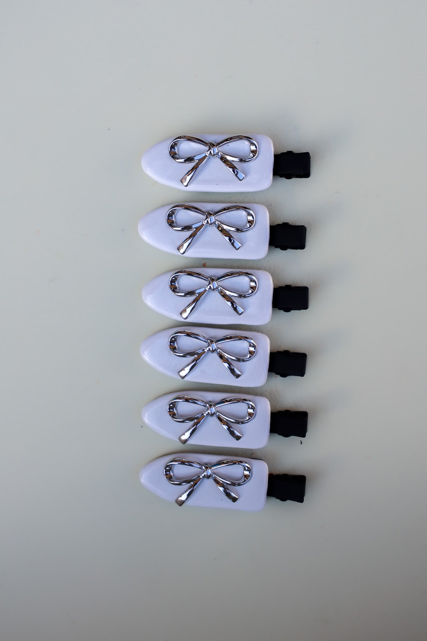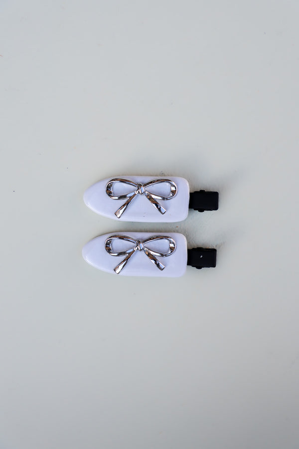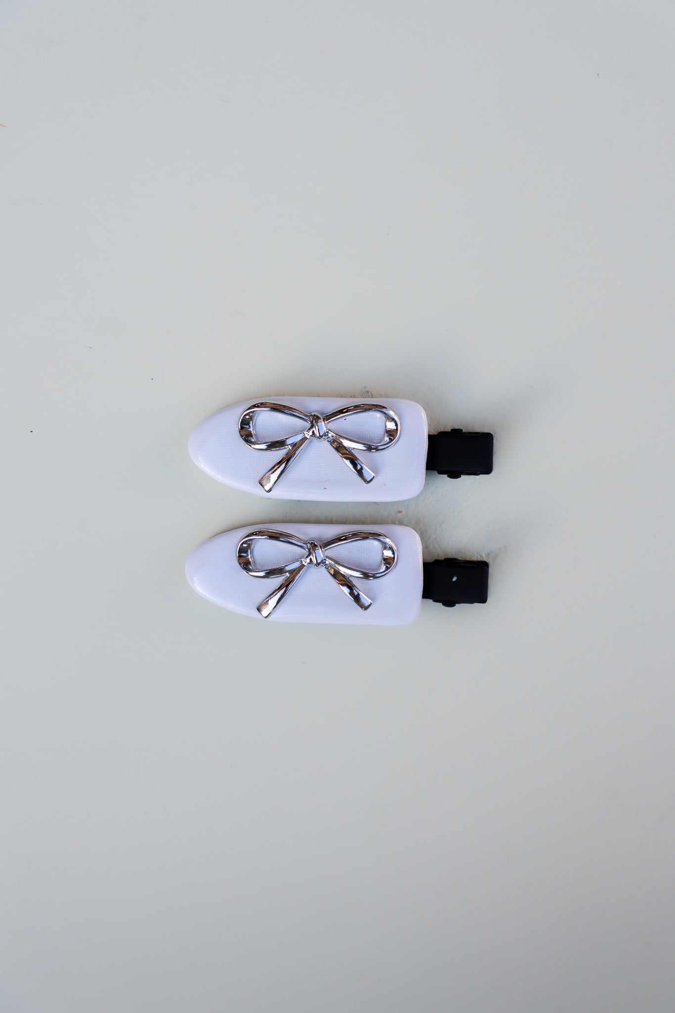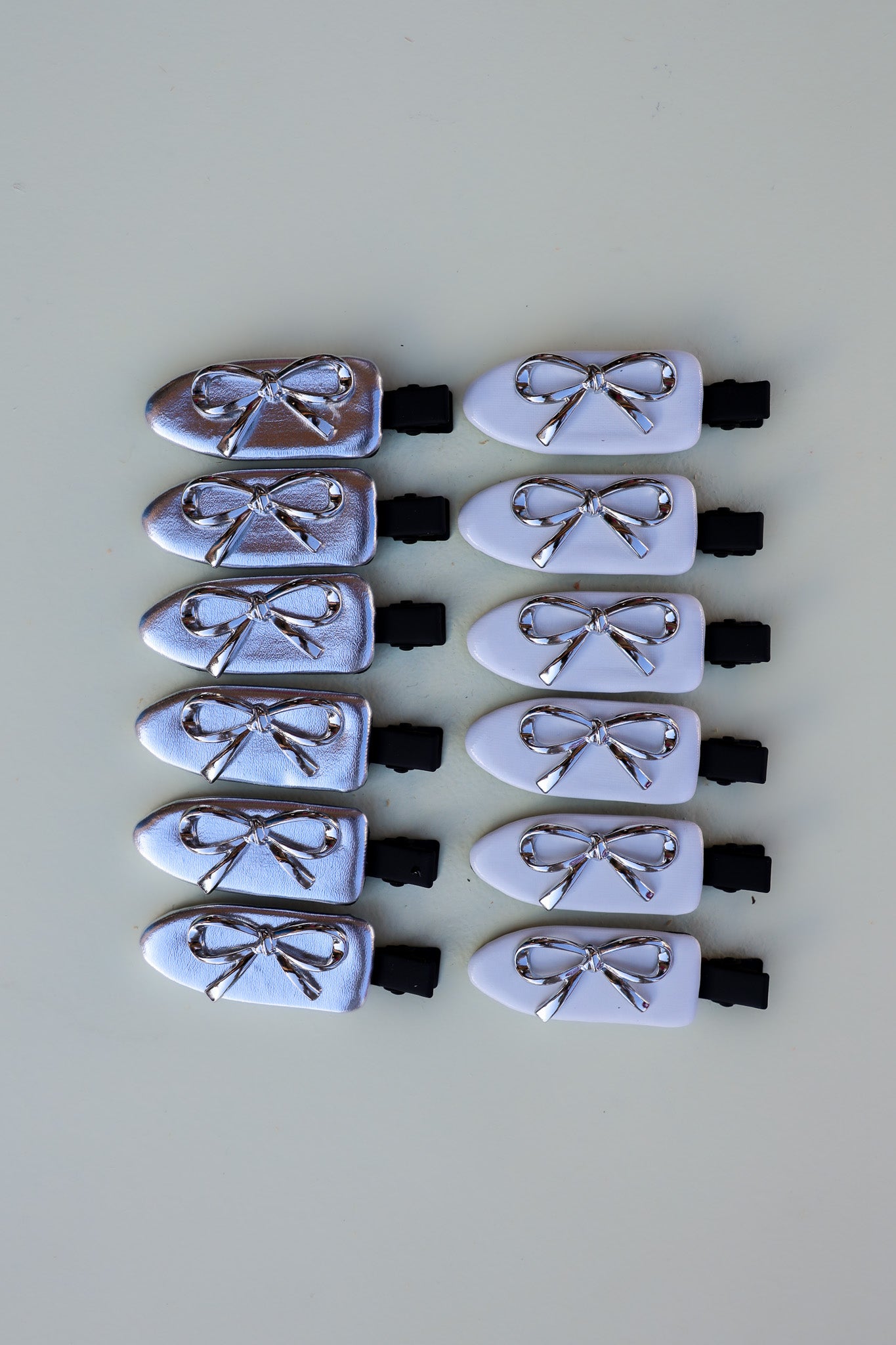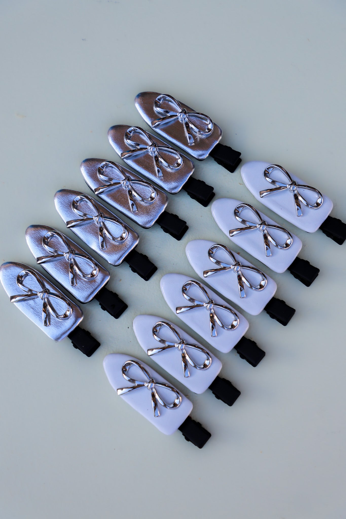 Cute, functional, and oh-so-chic — these clips keep your hair perfectly in place while you get ready. Each set comes with two clips and your choice of pearl white or metallic silver, both featuring a dainty raised bow detail. Ideal for makeup, skincare, or just keeping flyaways at bay in style.