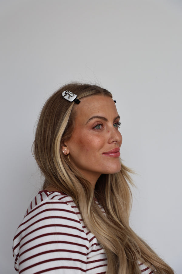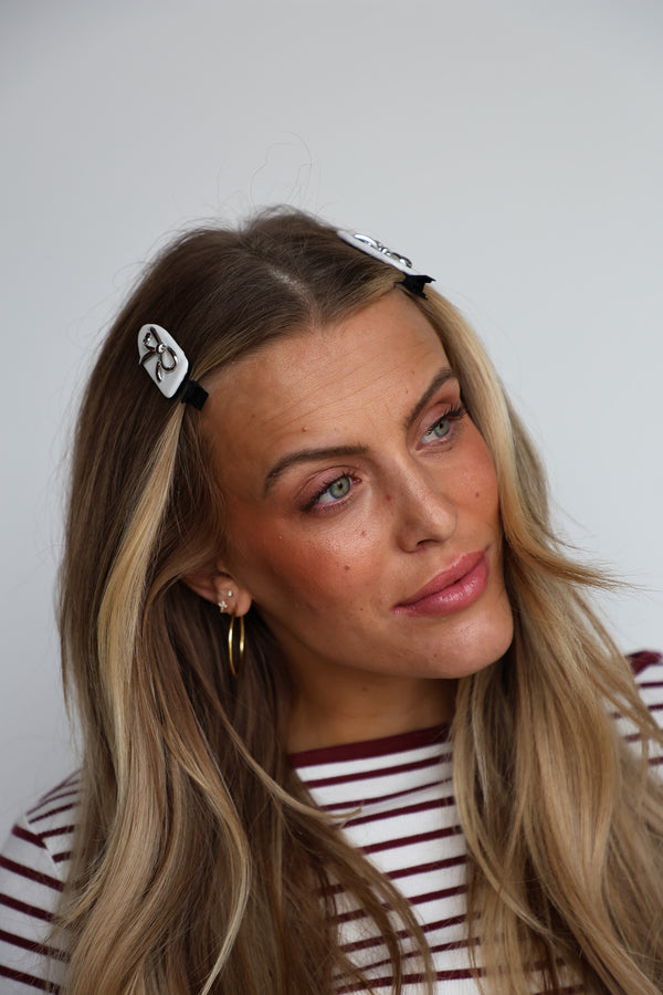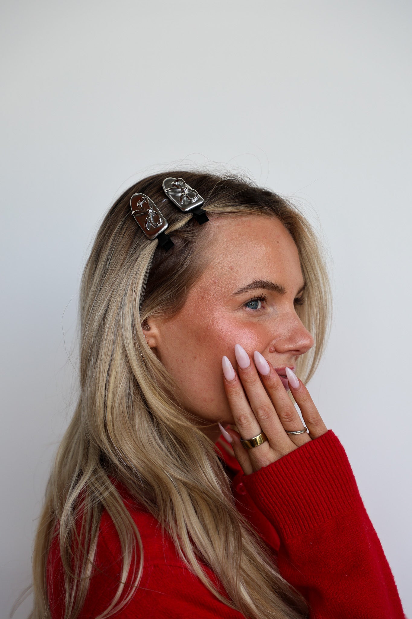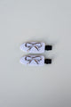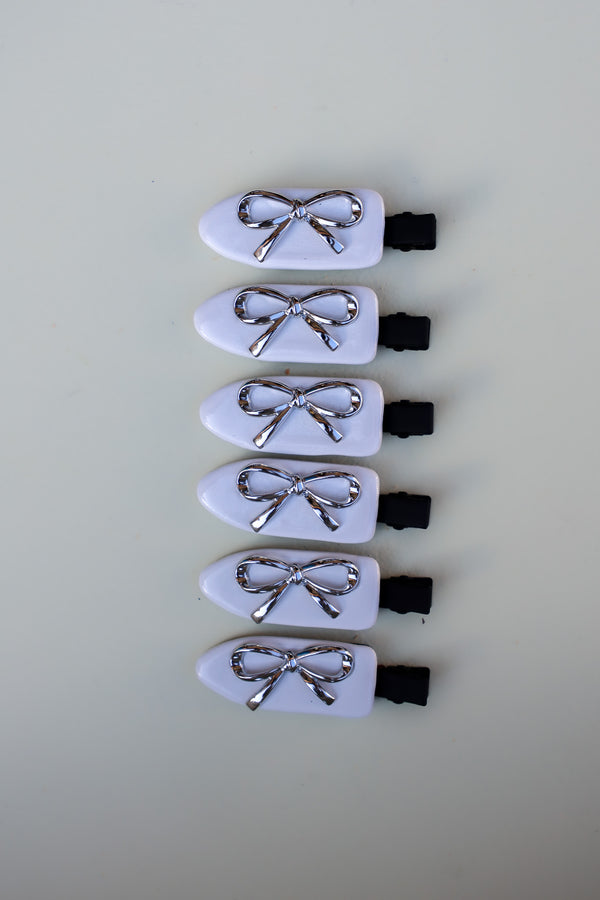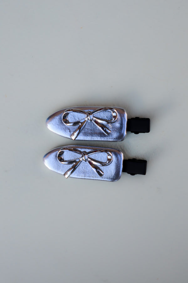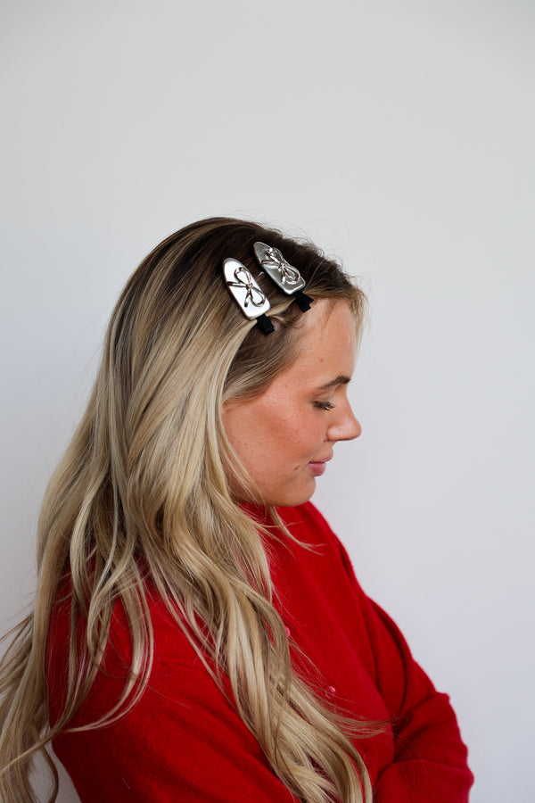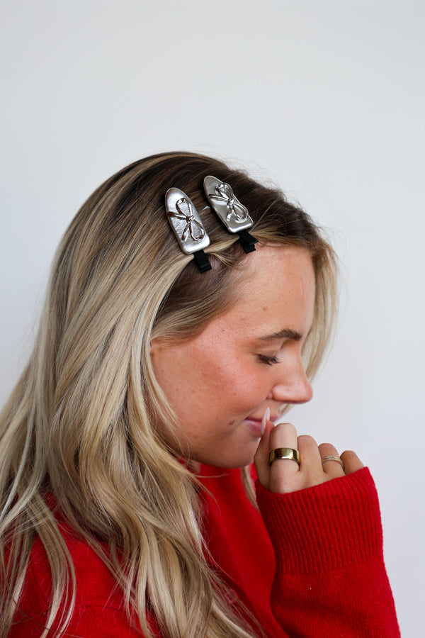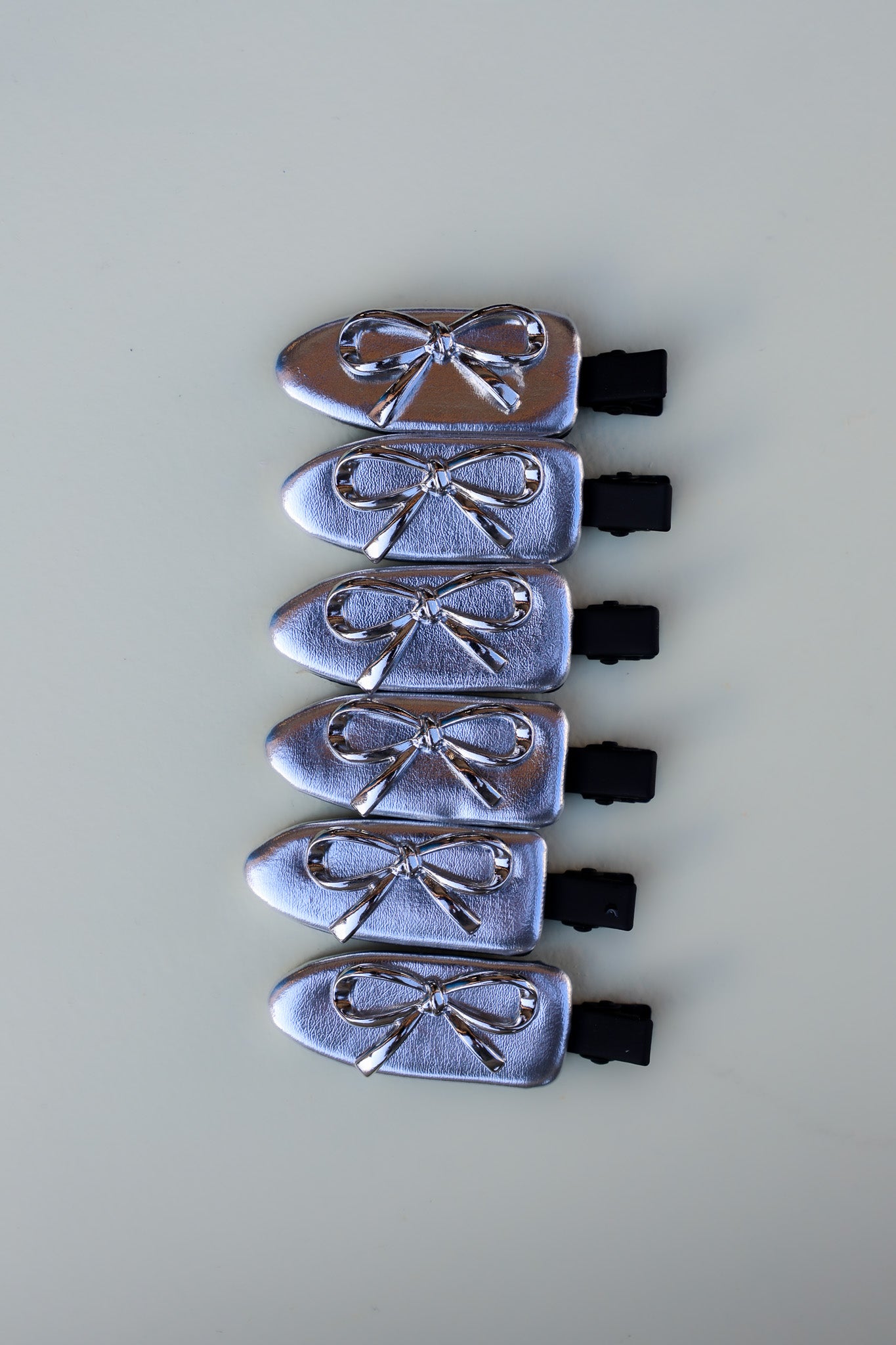 Cute, functional, and oh-so-chic — these clips keep your hair perfectly in place while you get ready. Each set comes with two clips and your choice of pearl white or metallic silver, both featuring a dainty raised bow detail. Ideal for makeup, skincare, or just keeping flyaways at bay in style.