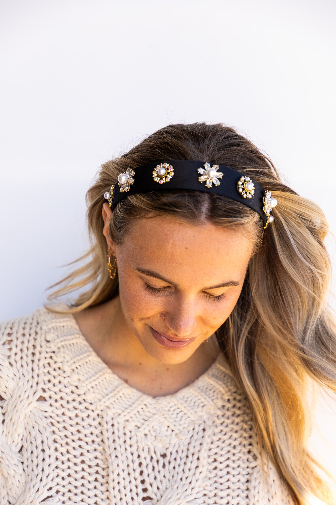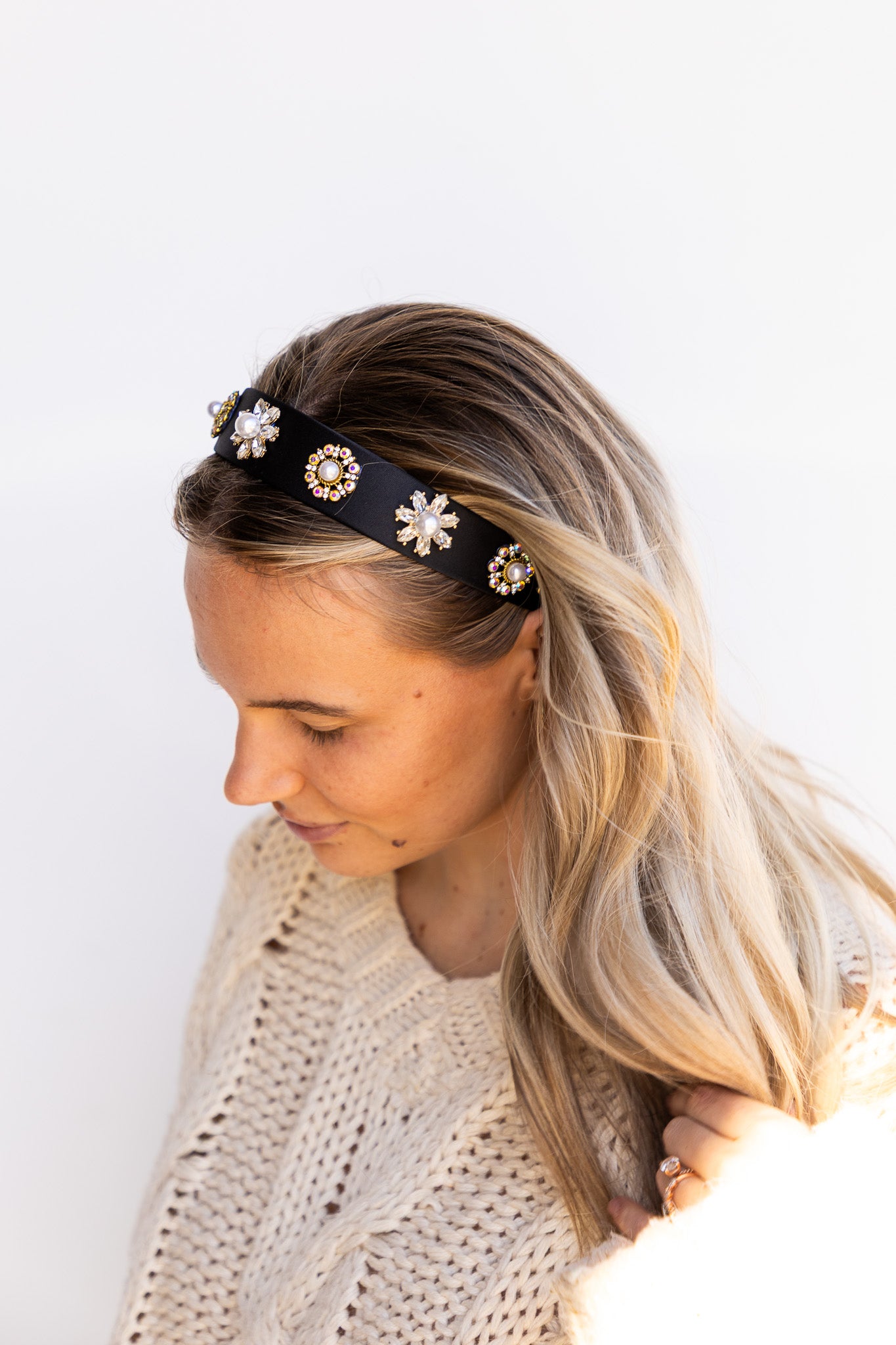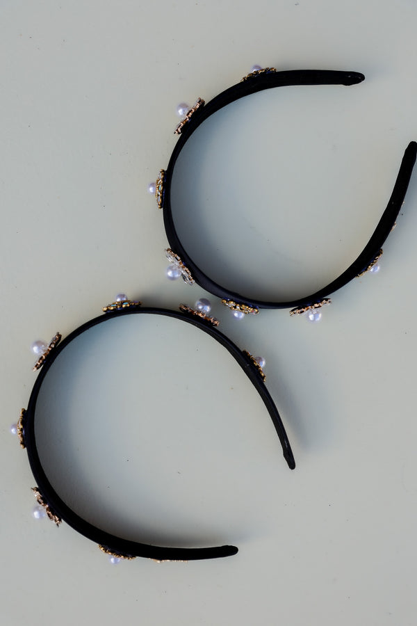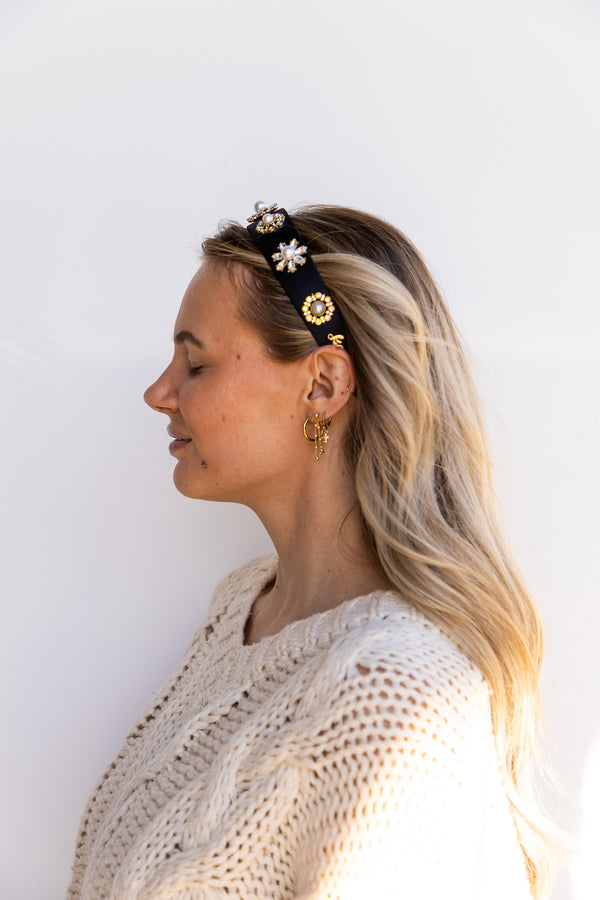 Make every outfit party-ready with this luxe black headband, embellished with sparkling crystals and pearl flower details. The perfect mix of glam and elegance for holiday dinners, New Year’s parties, or any night that calls for a little extra shine.
