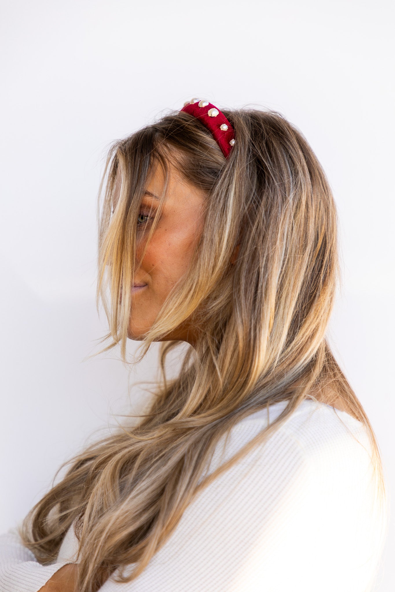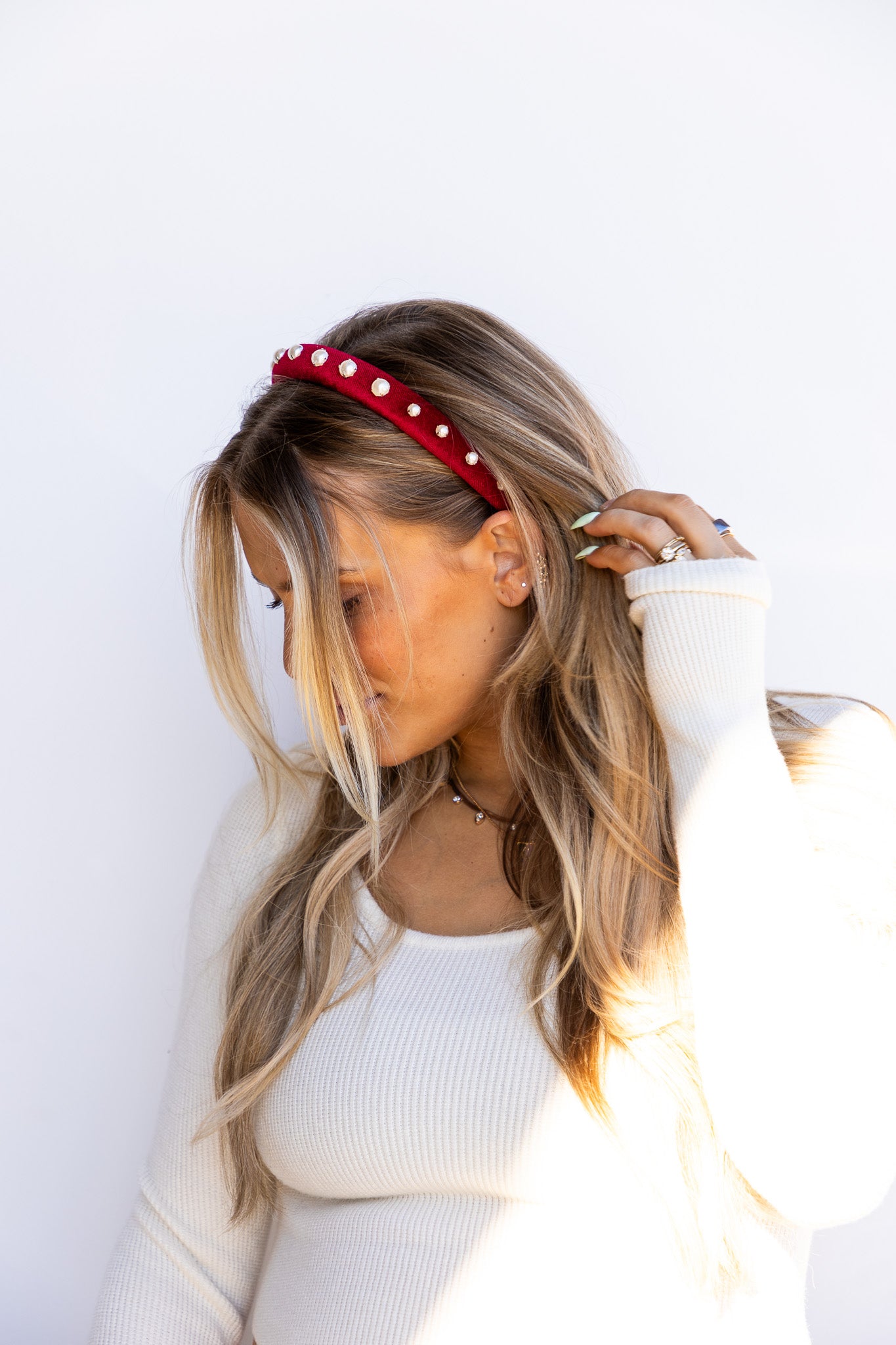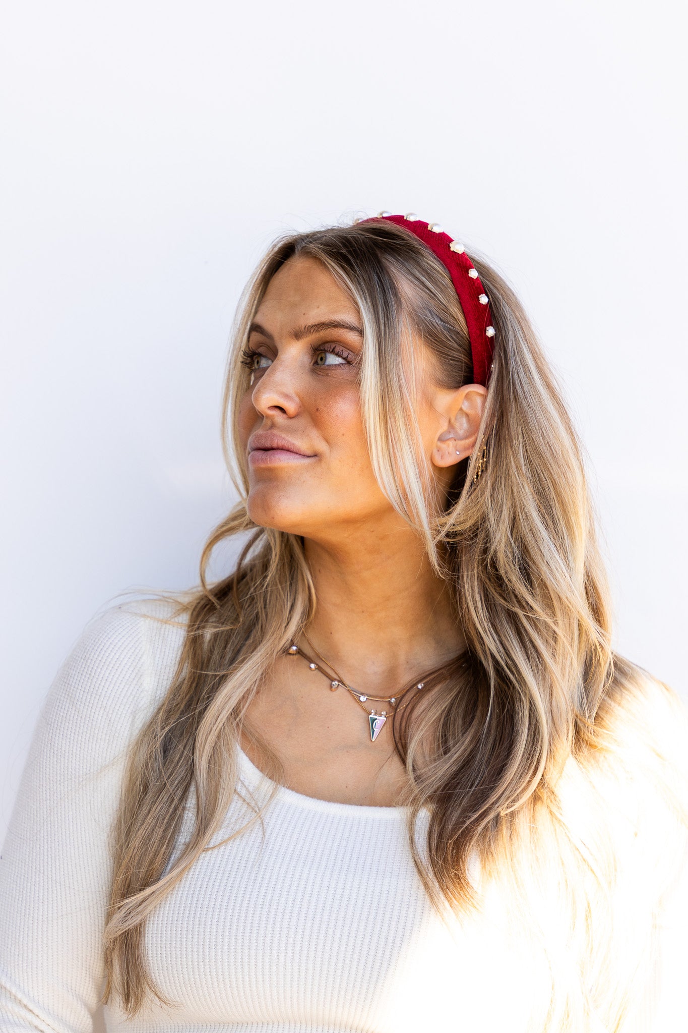 Bold yet elegant, this red studded headband is accented with a row of luminous faux pearls for the perfect mix of festive charm and everyday glam. Comfortable and eye-catching, it’s the ideal accessory to elevate holiday outfits, date-night looks, or a simple jeans-and-tee combo.