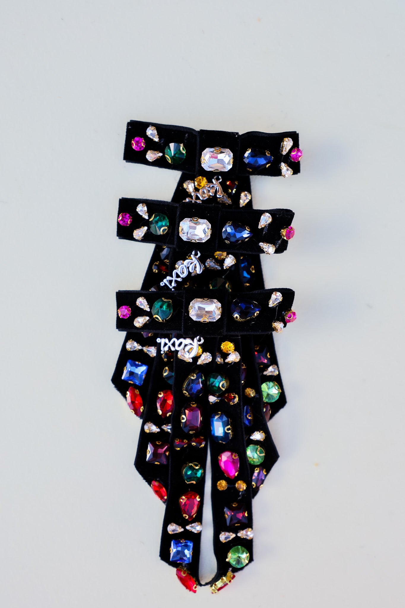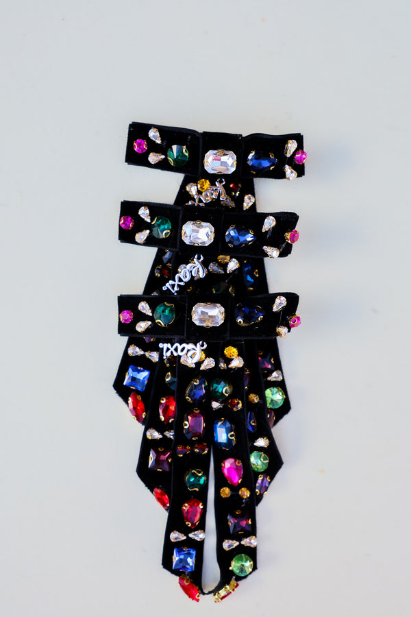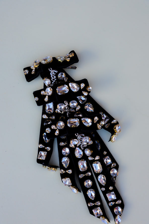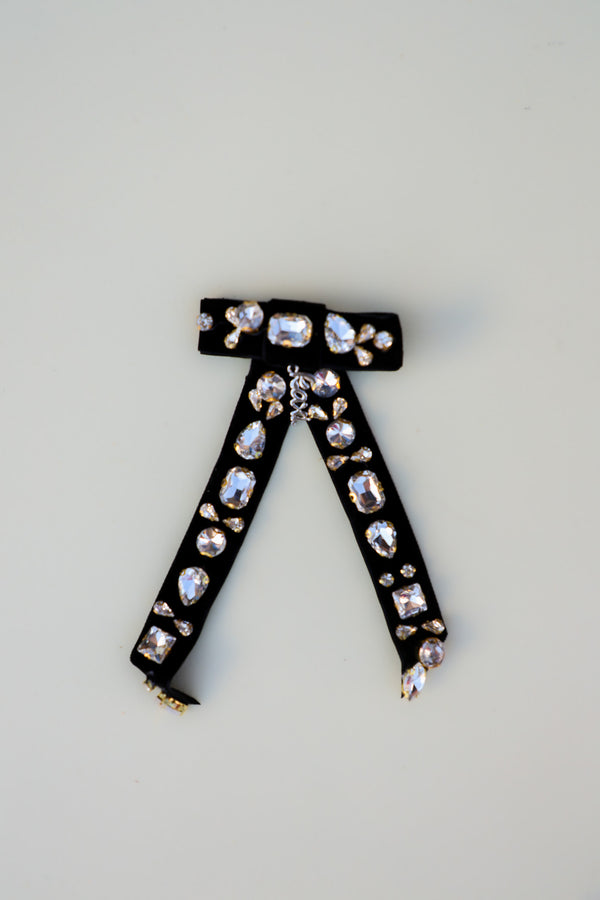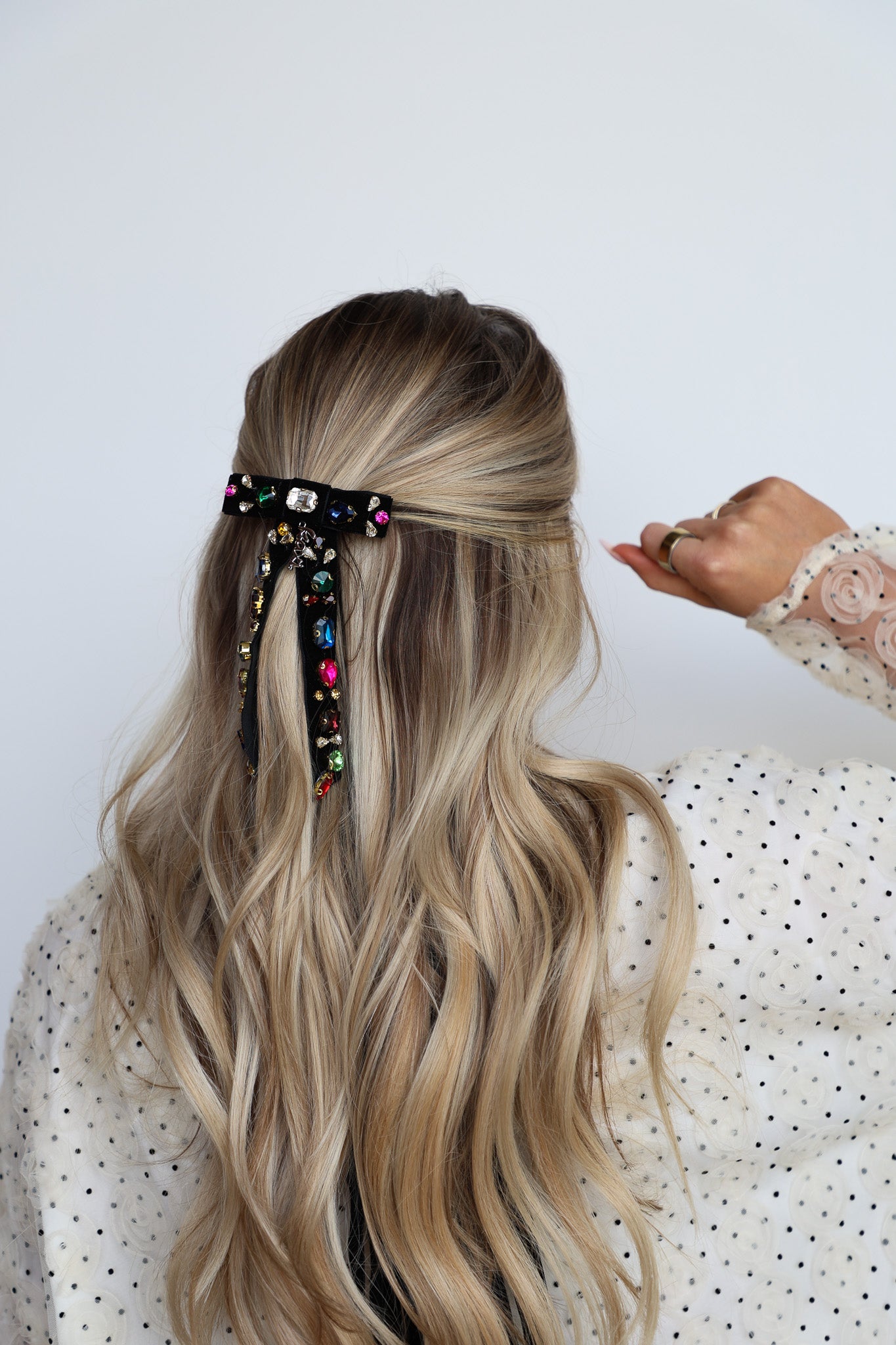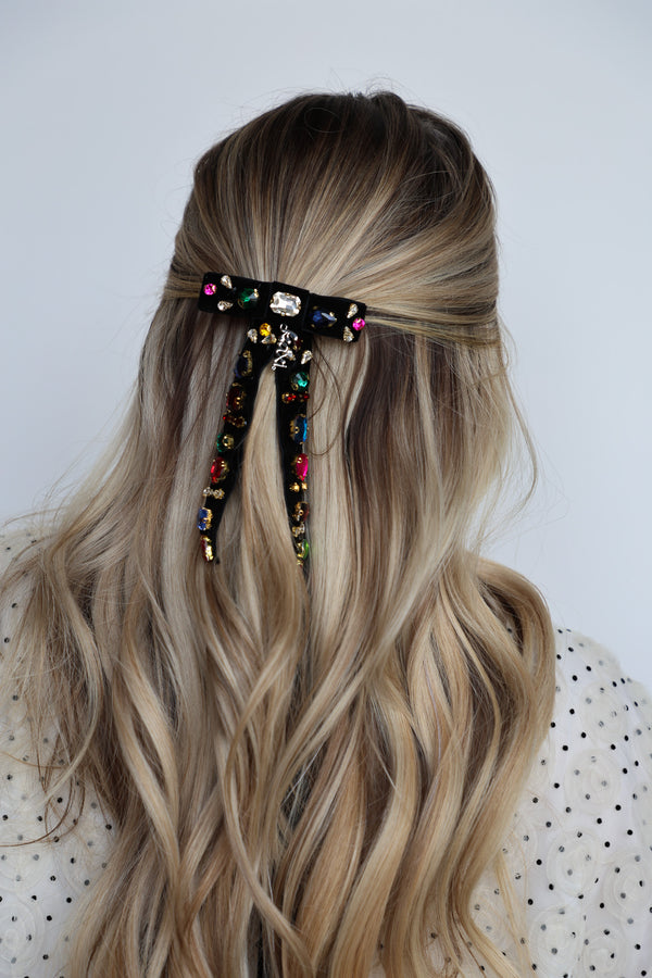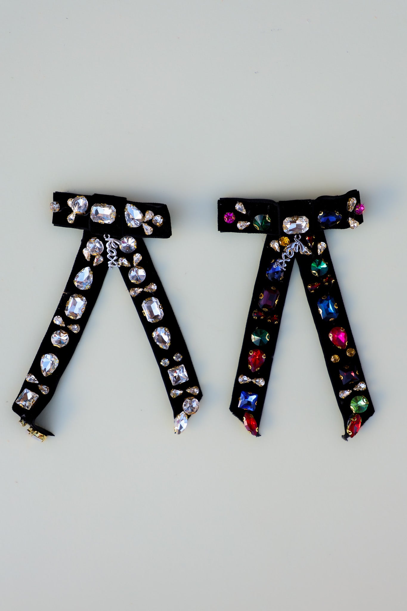 Bring instant glam to any hairstyle with these statement velvet bows, each covered in dazzling oversized gems. Choose between classic clear crystals for a timeless sparkle or vibrant multicolored stones for a bold, playful pop.