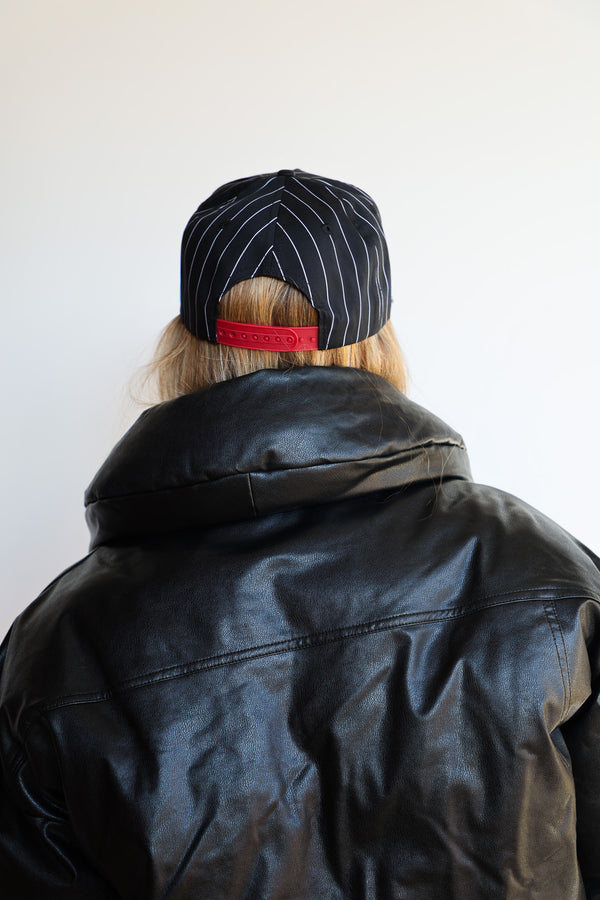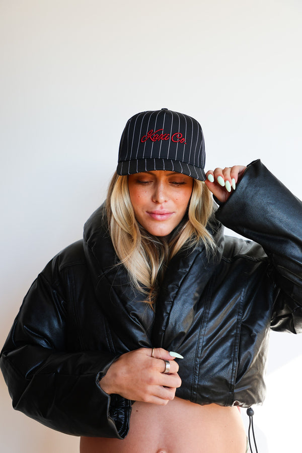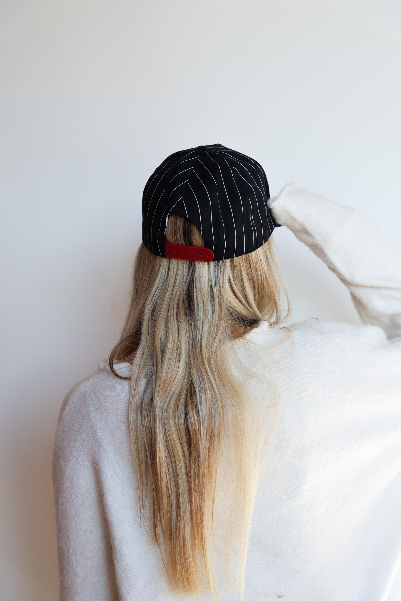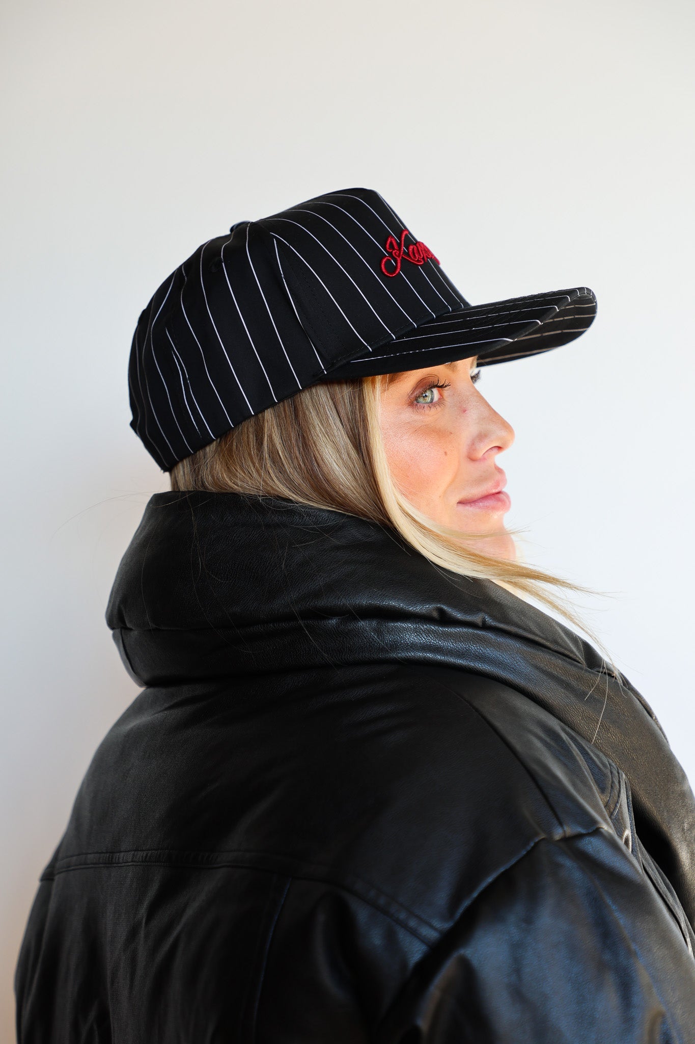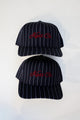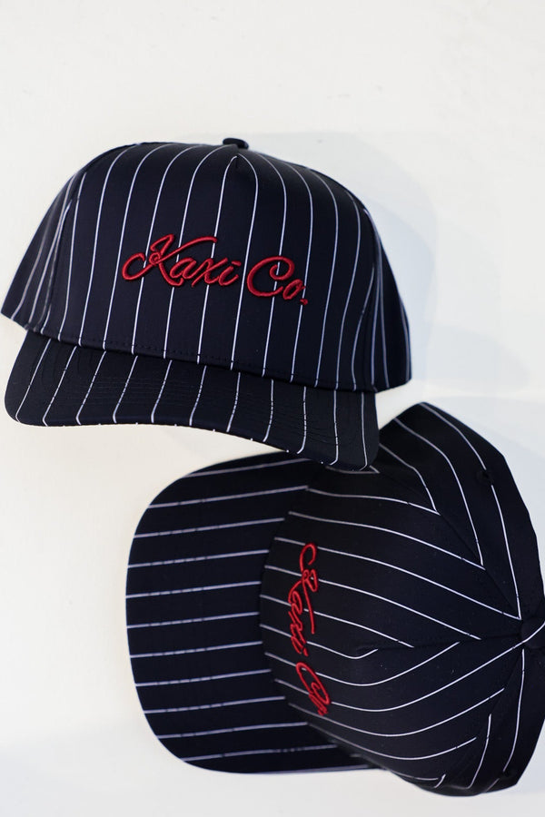 This comes in a black hat with skinny white pinstripes and a red embroidered kaxi on the front.