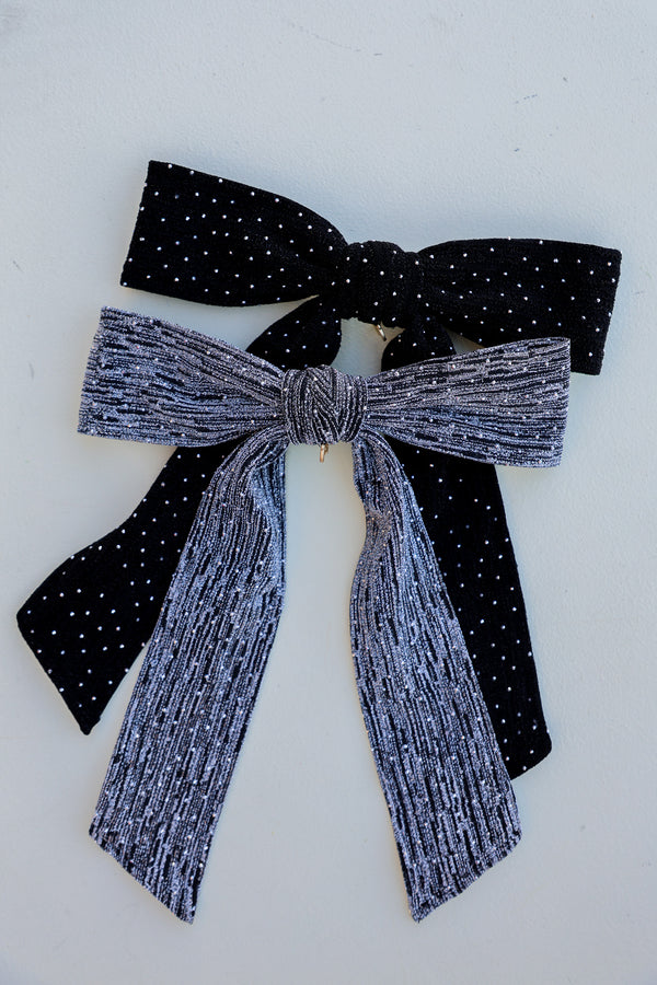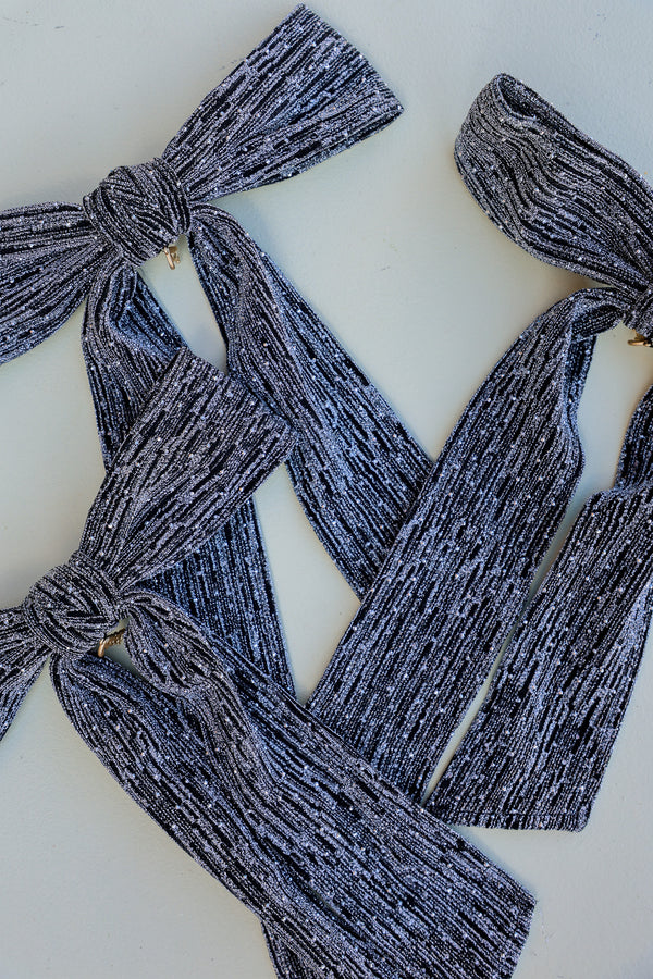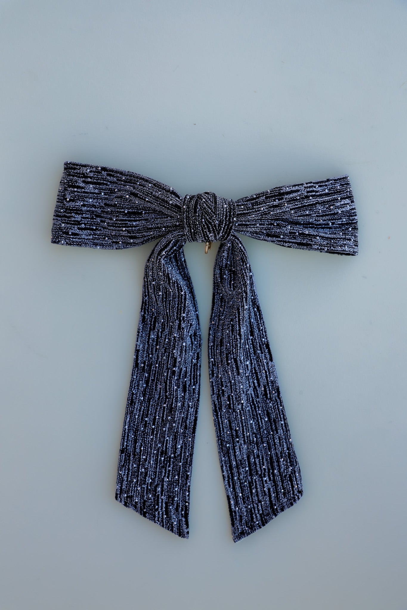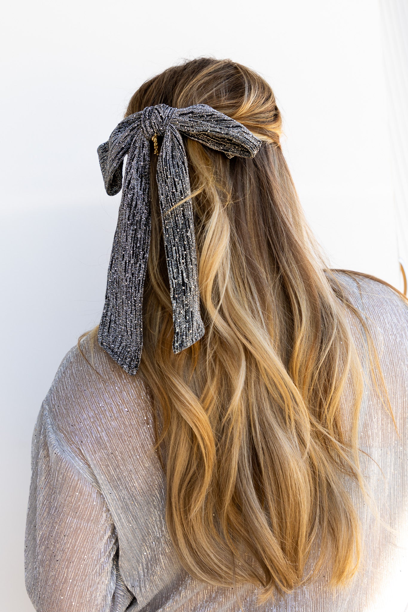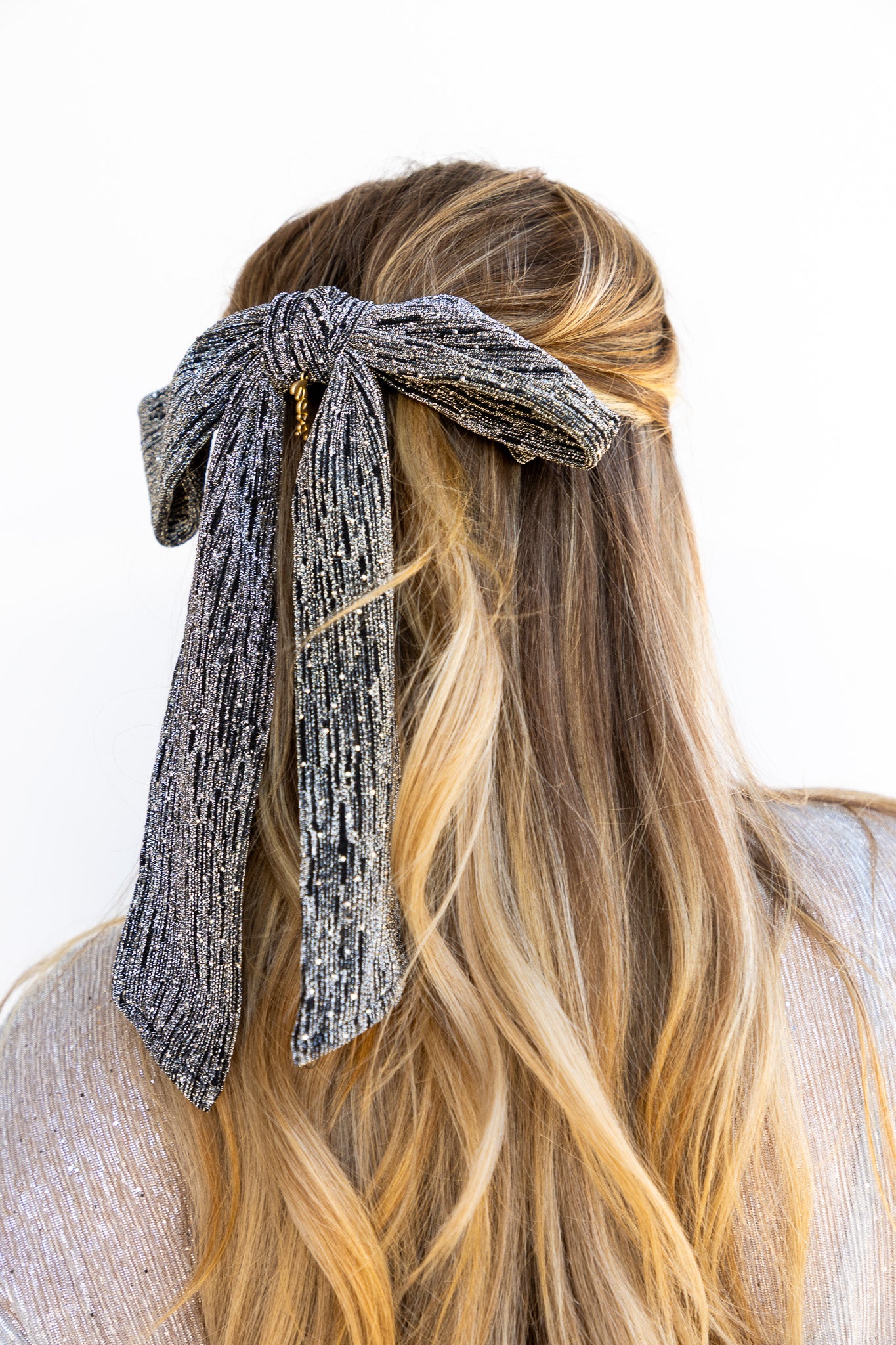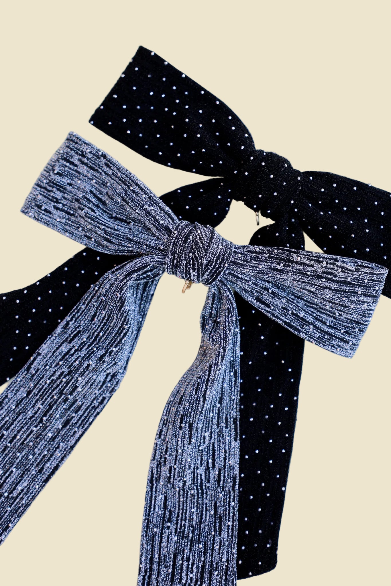 Celebrate the countdown in style with these sparkling statement bows — made to shine long after the ball drops. Choose from classic black with twinkling silver studs or metallic silver shimmer for the ultimate party-ready look. Perfect for topping off your New Year’s Eve outfit with a little extra glam.