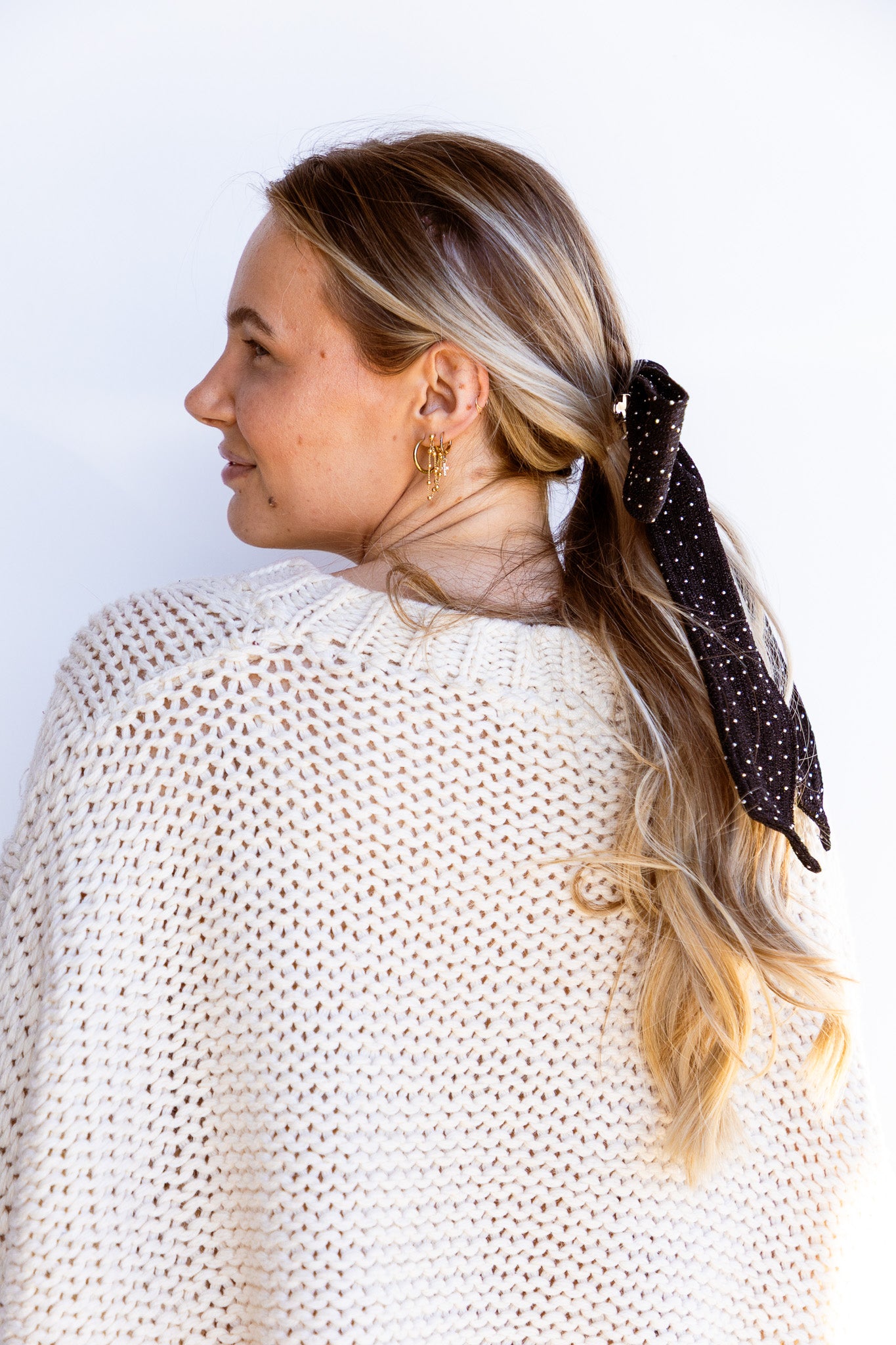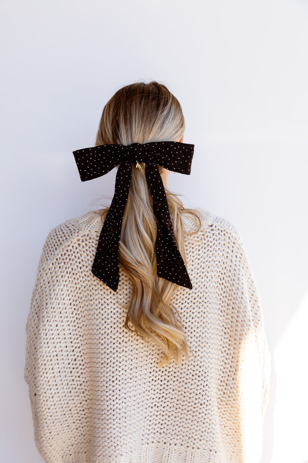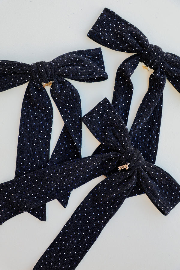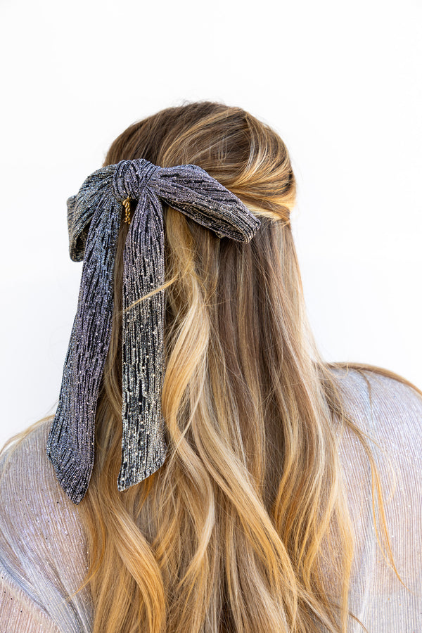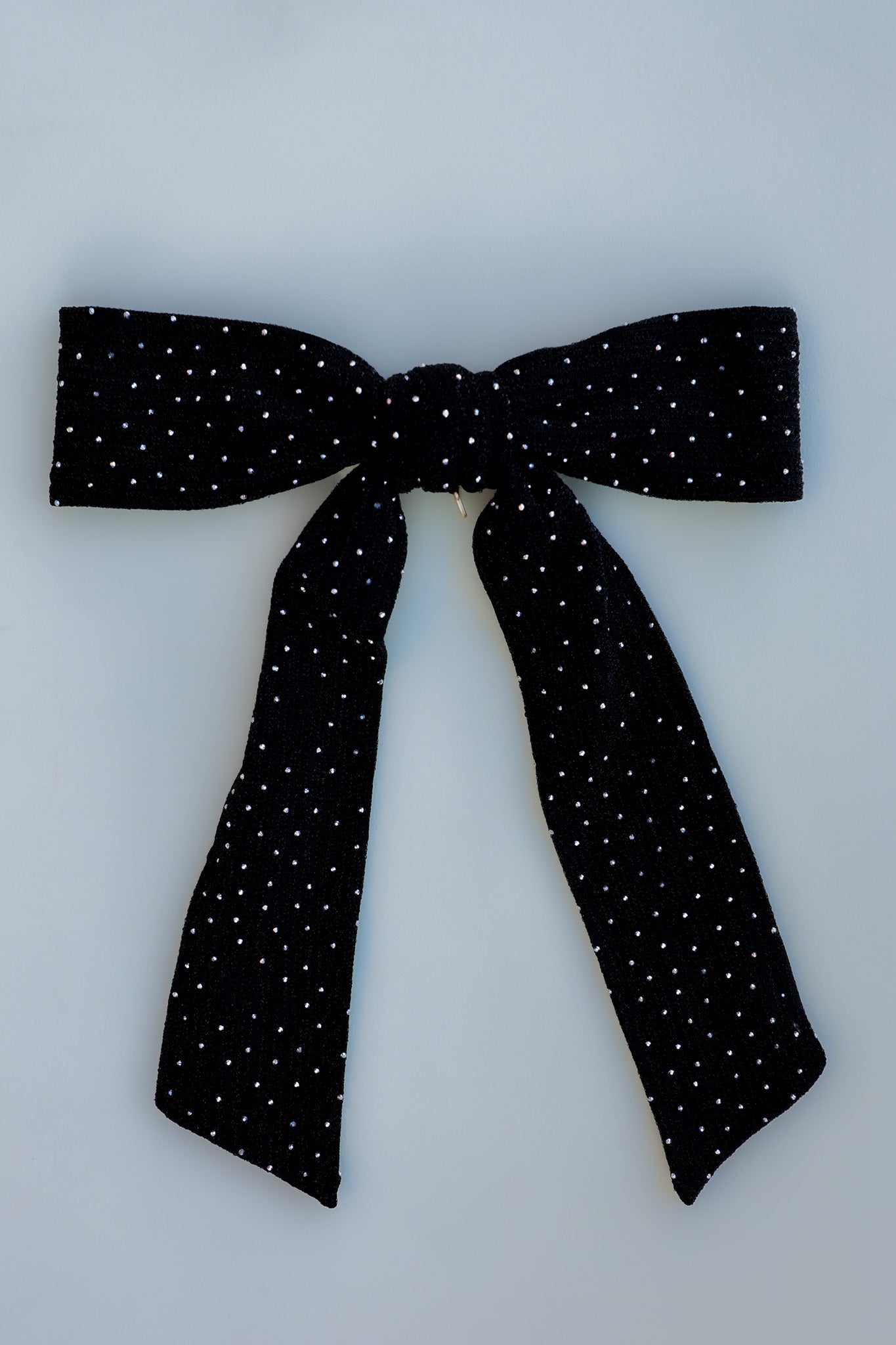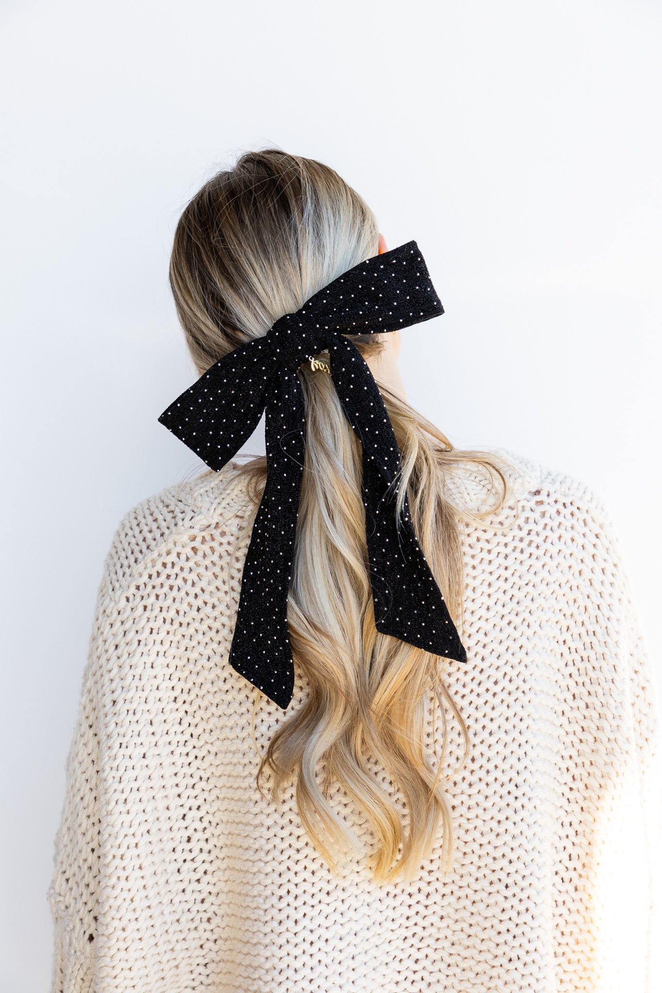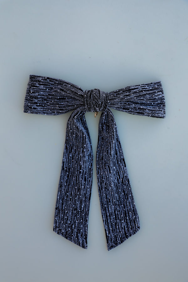 Celebrate the countdown in style with these sparkling statement bows — made to shine long after the ball drops. Choose from classic black with twinkling silver studs or metallic silver shimmer for the ultimate party-ready look. Perfect for topping off your New Year’s Eve outfit with a little extra glam.