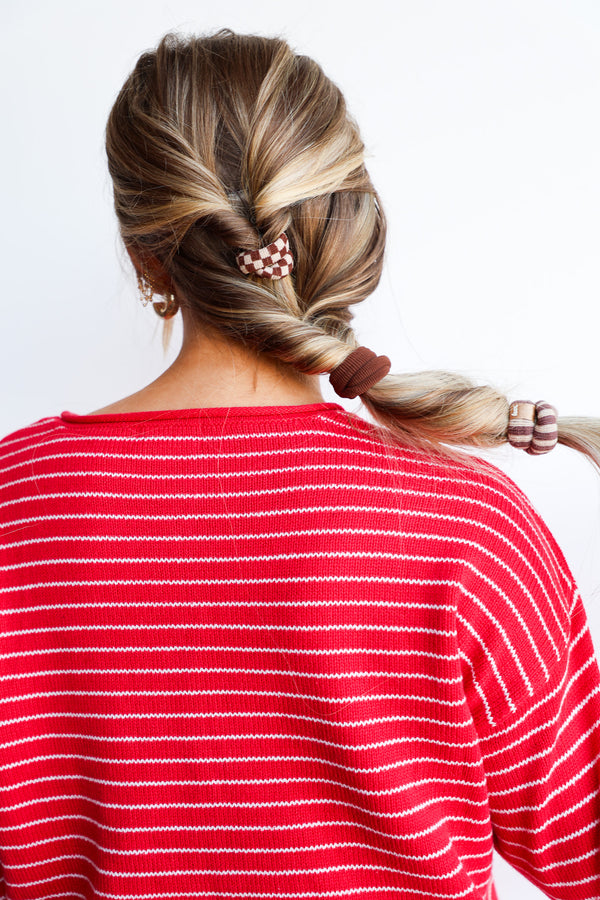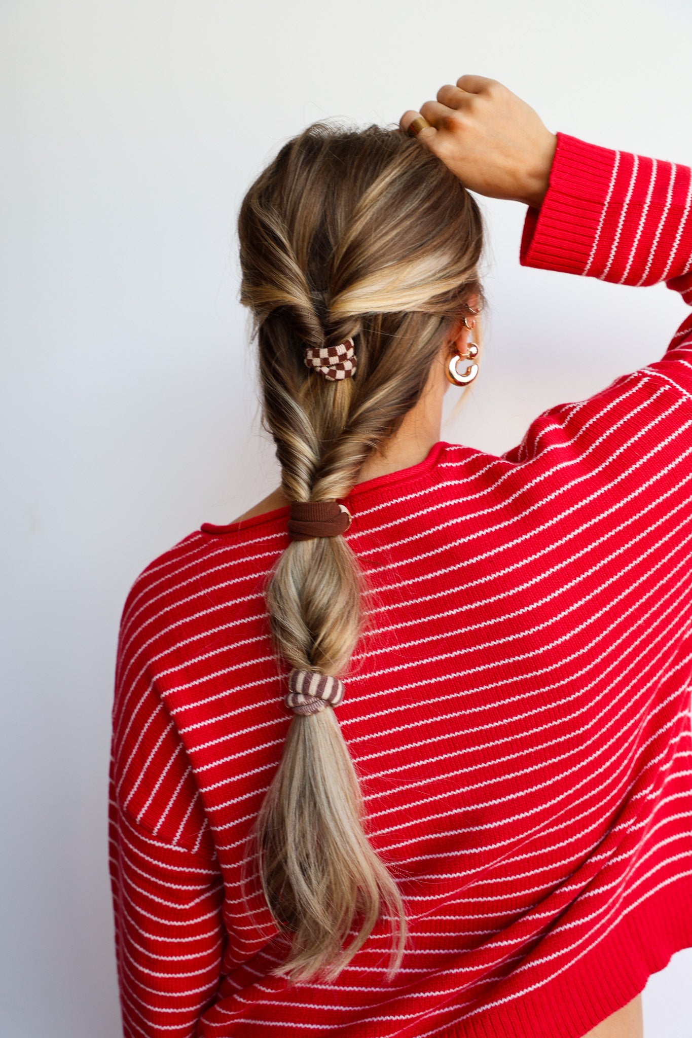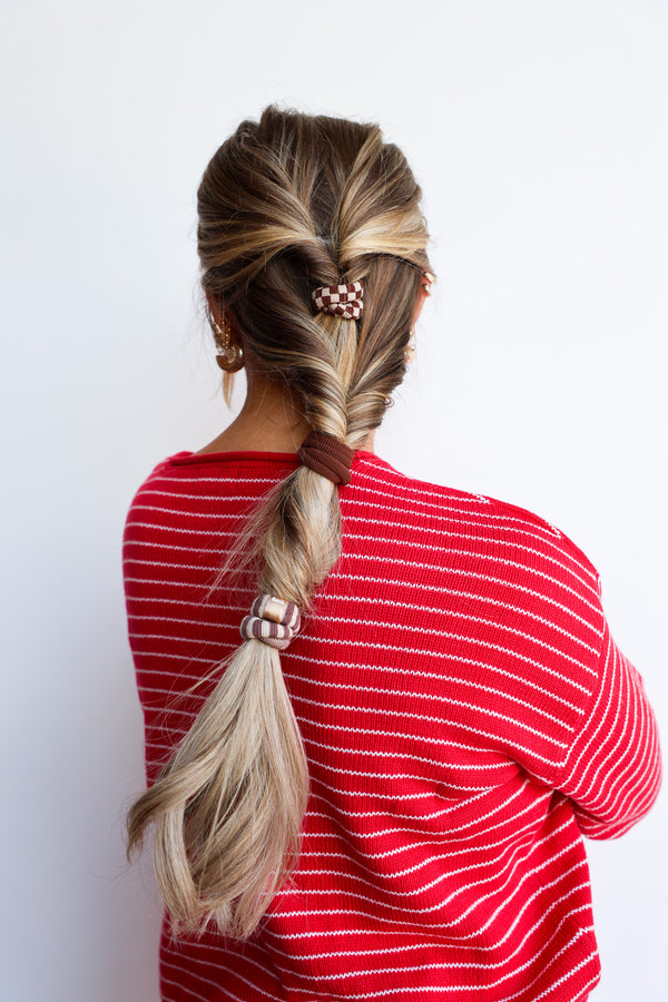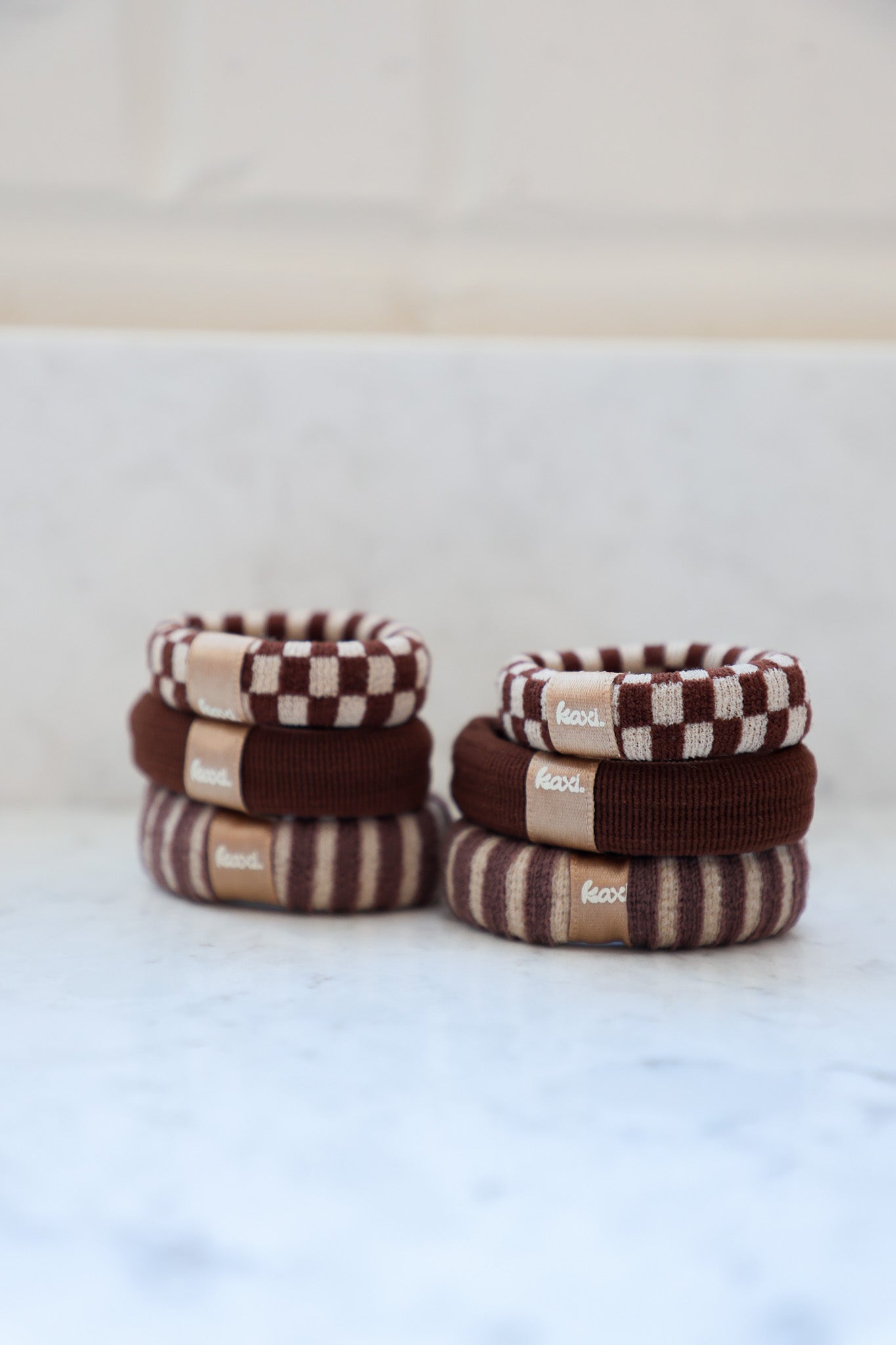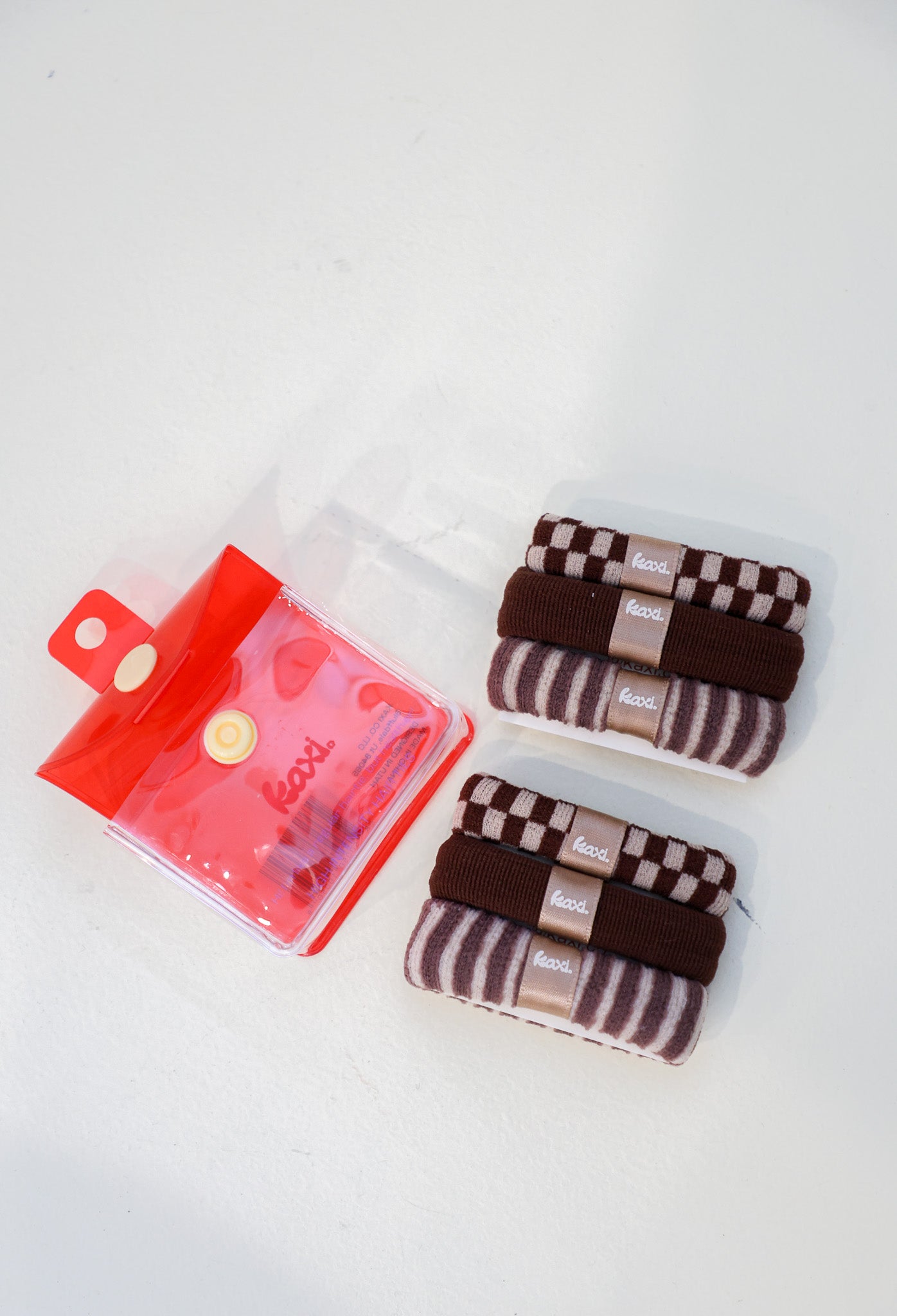 These come in 3 different patterns all completed with our very own KAXI logo on it!! Get a pack of 6 neutral colored hair ties: a checkered, solid, and striped patterns! Crafted with a durable yet snug nylon material, these hair ties are designed to keep your hair in place without tugging or causing pain.  They are perfect if you need a tight elastic for your high intensity workout, but still offer a stylish look and this elastic is just fabric with no elastic on the inside to damage your hair. Say goodbye to breakage around your face. Works for thin to thick hair! Perfect for pool days, high intensity workouts, or everyday use!
