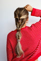 Person with long hair tied in a blue scrunchie, wearing a textured cream sweater.