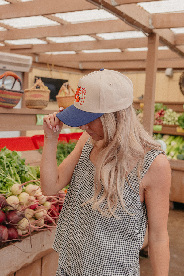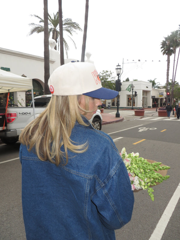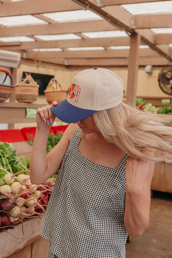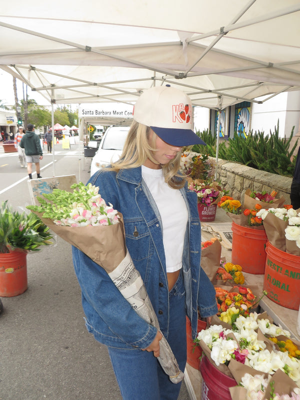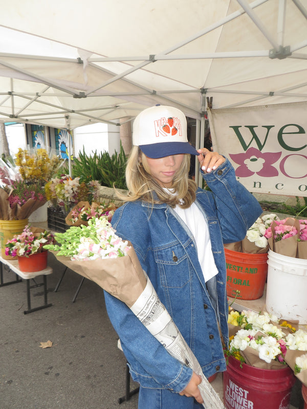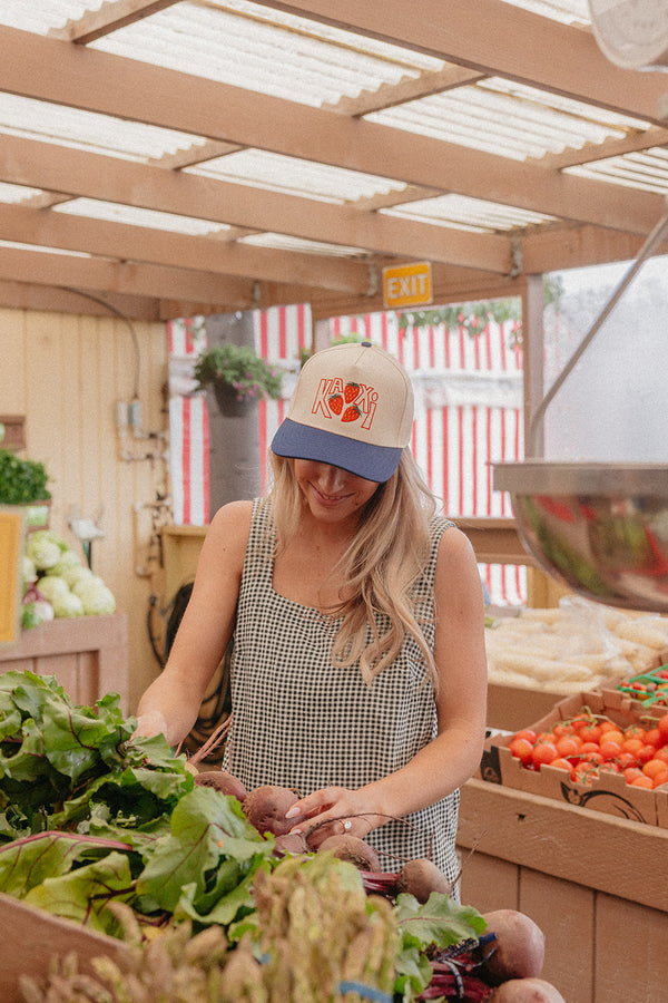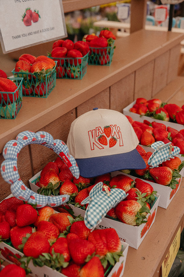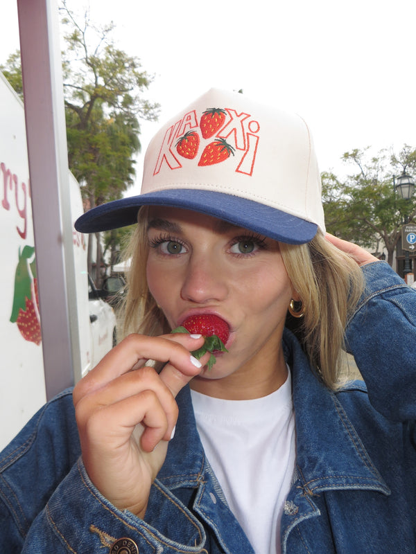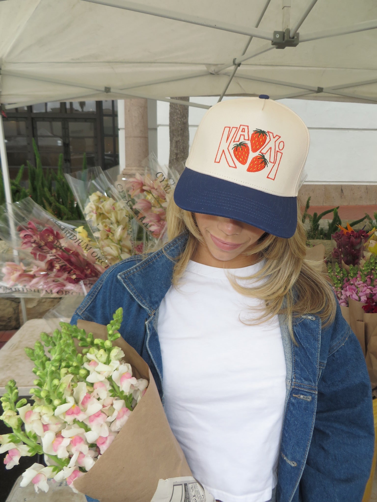 Our KAXI Strawberry Trucker Hat brings that classic Americana energy with a fresh, playful twist. Designed with a creamy structured crown and a rich blue brim, this hat features bold KAXI lettering layered with embroidered strawberries for the perfect pop of color.
