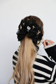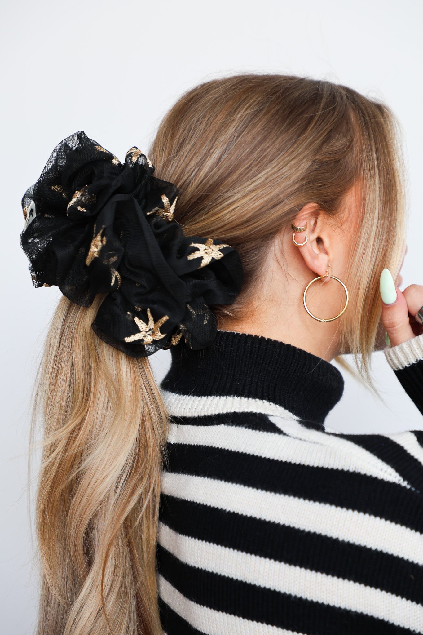 introducing your new obsession: the jumbo organza scrunchie. Made for the girls who love a little extra drama (in the cutest way possible). this sheer, airy organza fabric floats around your ponytail or bun for the dreamiest and chic pop to your outfit. This fabric not only is lightweight but also has embroidered accents of stars.