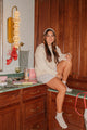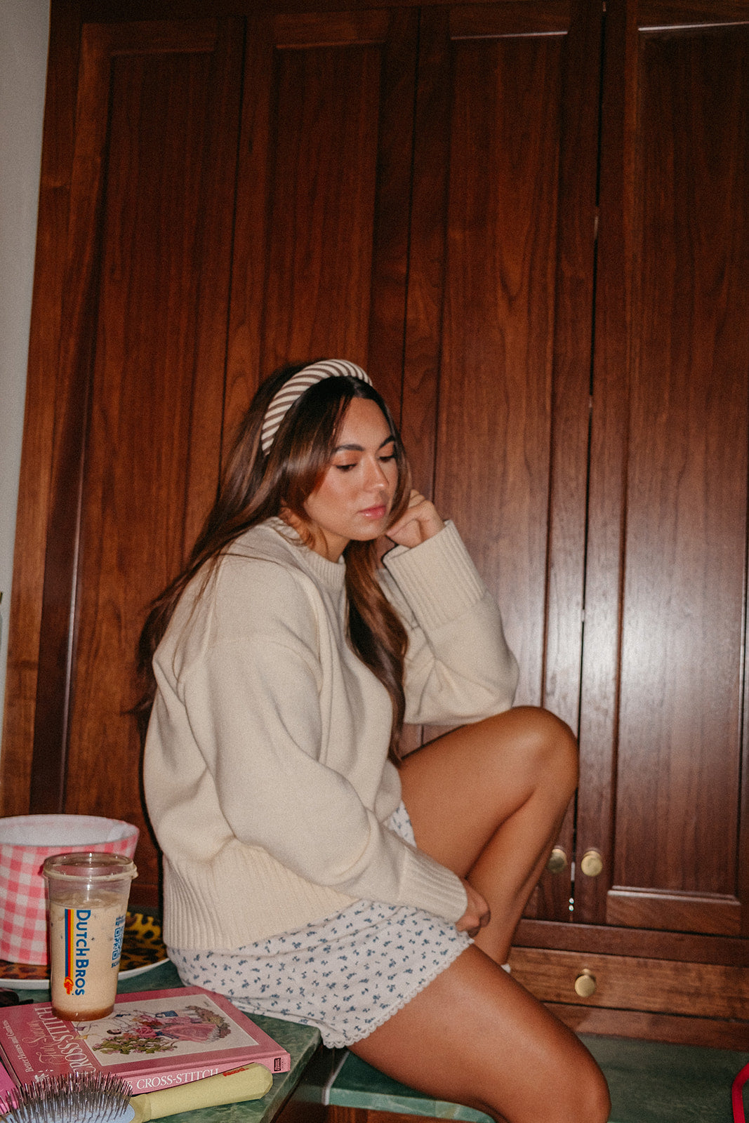 Person with long hair tied in a blue scrunchie, wearing a textured cream sweater.