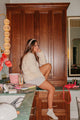 Woman in yellow sweater lying on yellow surface with hand above head.
