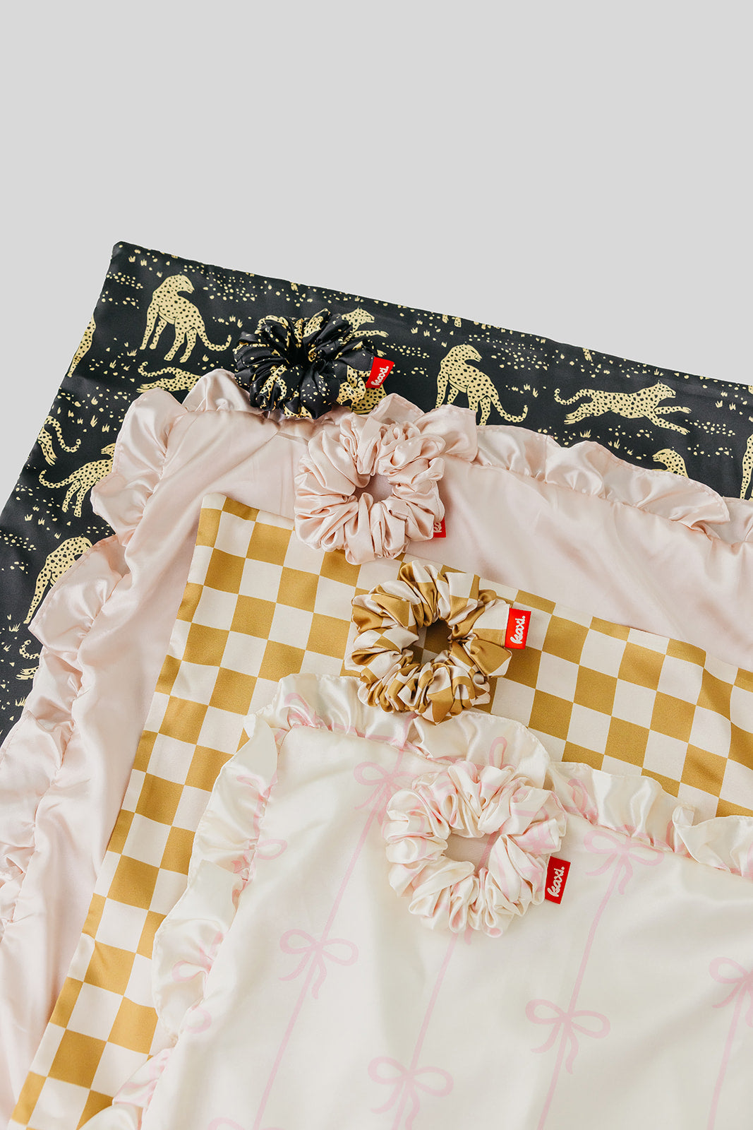 choose from four signature looks—Black with Cheetah, Neutral Checkered, Bow, and Solid Champagne—each available with or without a ruffle border. Cute, elevated, and made to match your personal vibe.
