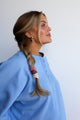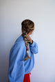 Person with long hair tied in a blue scrunchie, wearing a textured cream sweater.