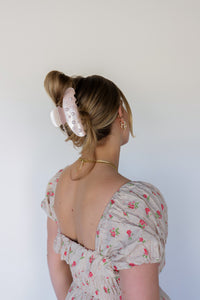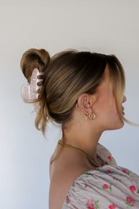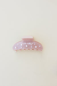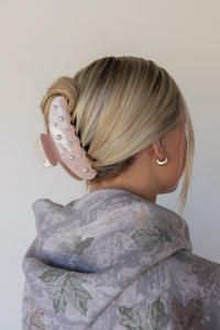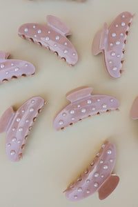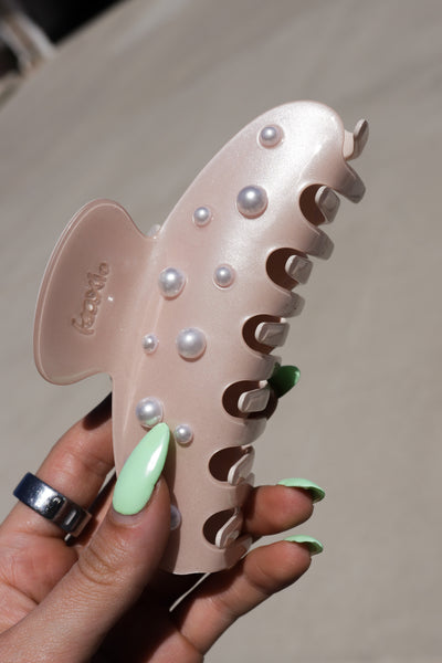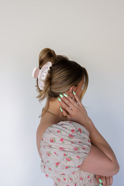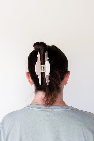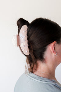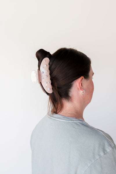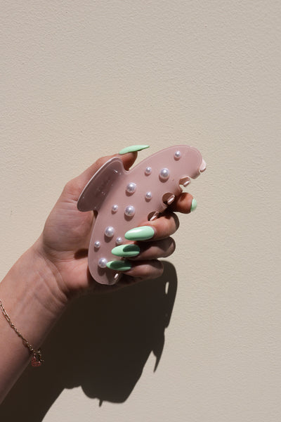 Our spring pearl claw is the perfect claw when you are ready for your hair to up and out of your face all day long! This claw is a subtle shimmery pink acetate clip with pearls accenting each side, and an engraved kaxi logo on the handle. It is subtle yet girlie and all of our pink loving girlies need this in their collection.