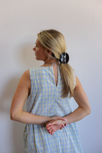 Woman with a ponytail using a large blue gingham scrunchie.
