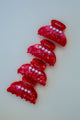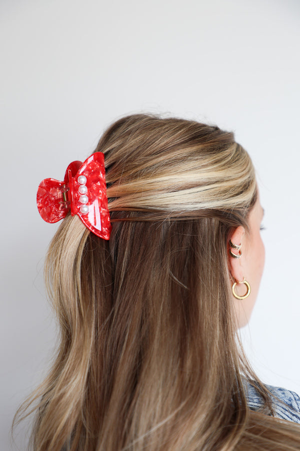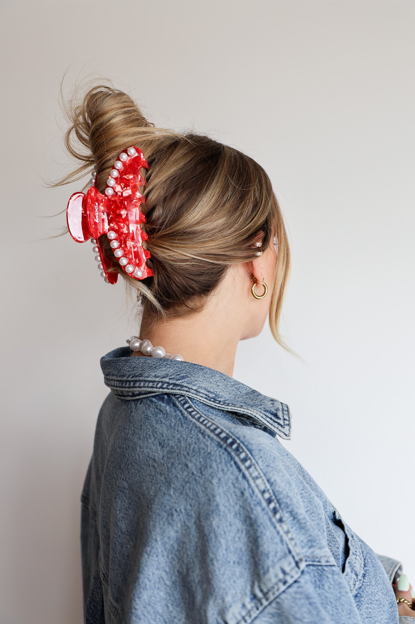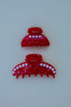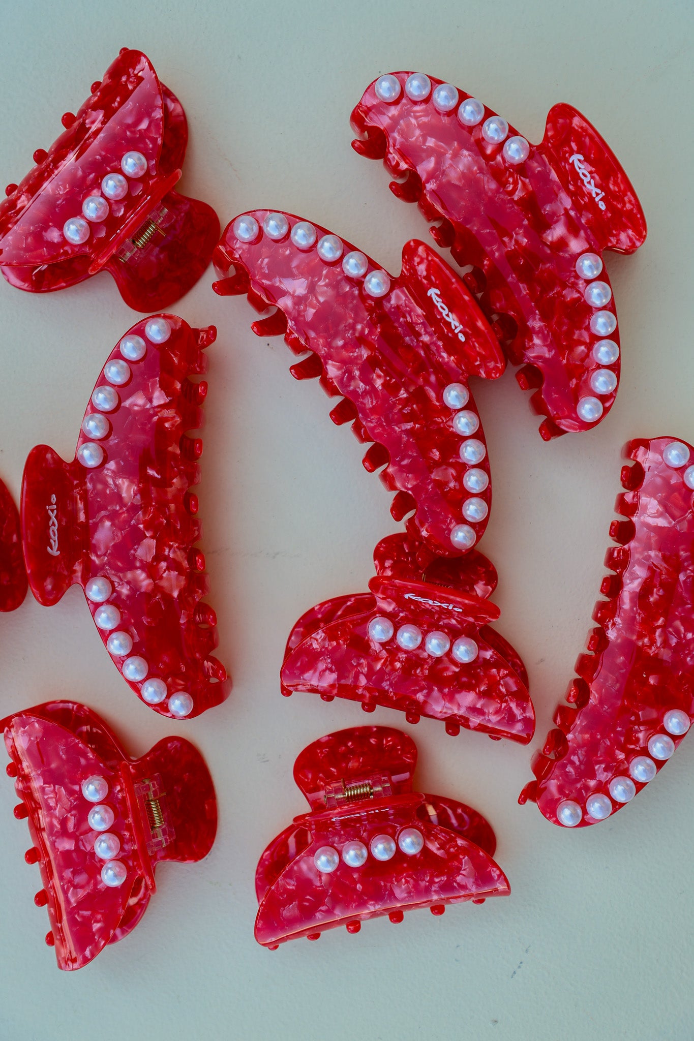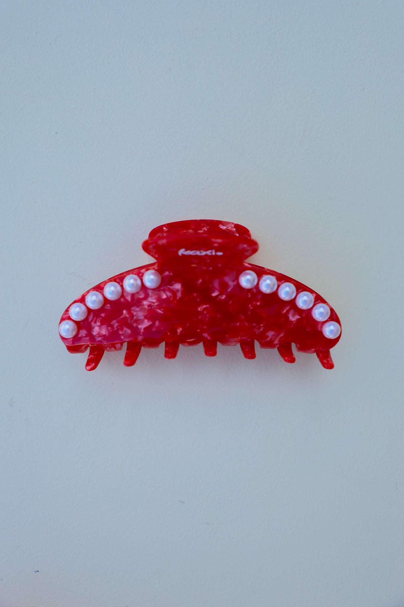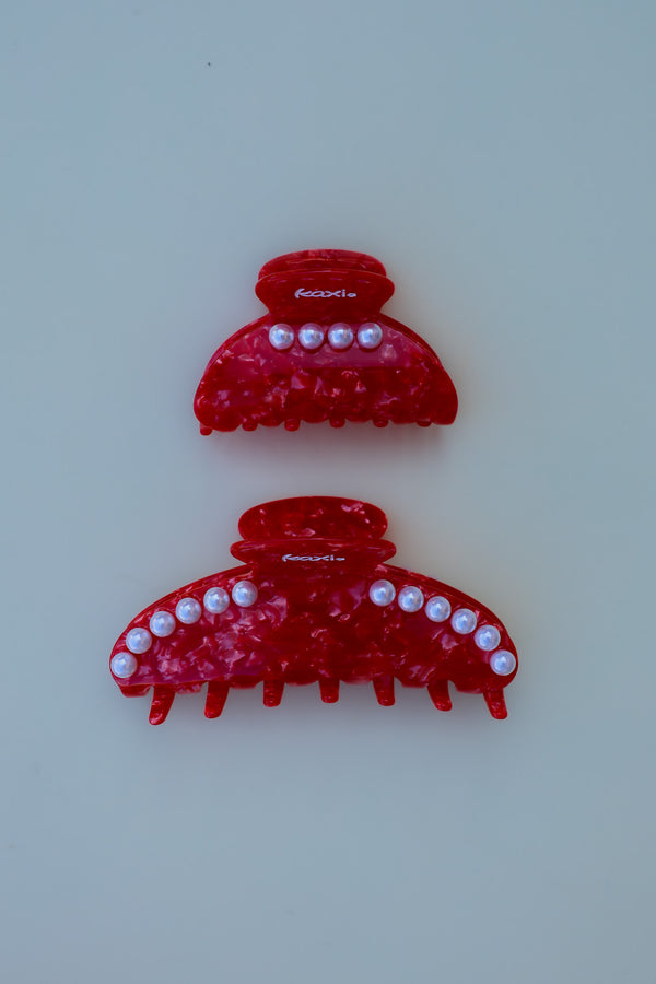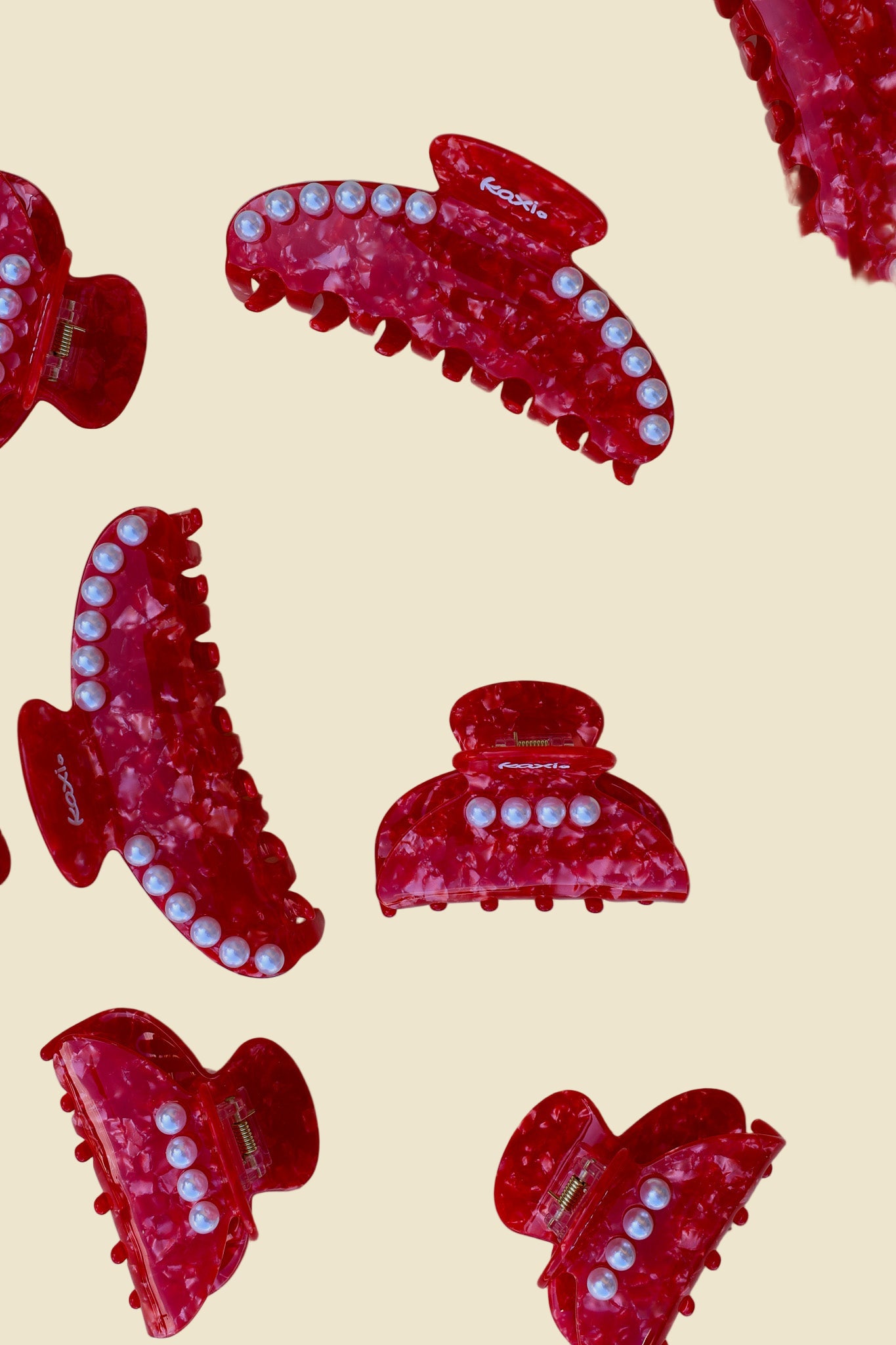 Bold, glossy, and effortlessly chic — these red acetate claws bring a pop of color and a touch of elegance to any hairstyle. Each claw is finished with luminous pearl accents and comes in two sizes to fit your style: